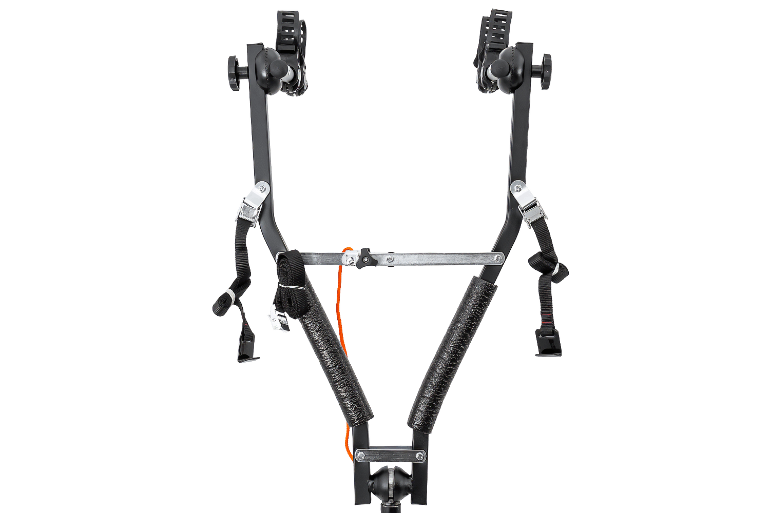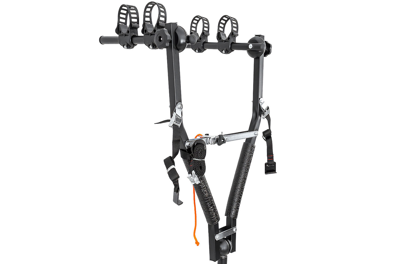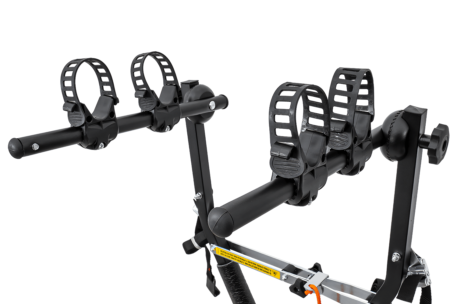 Een groot voordeel van deze drager is het doordachte fietsbevestigingssysteem. Elke fiets staat stevig in de daarvoor bestemde houder , vastgezet met een duurzame, verstelbare rubberen band . Deze functie maakt het mogelijk om fietsen met zowel brede als smalle frames efficiënt te vervoeren.