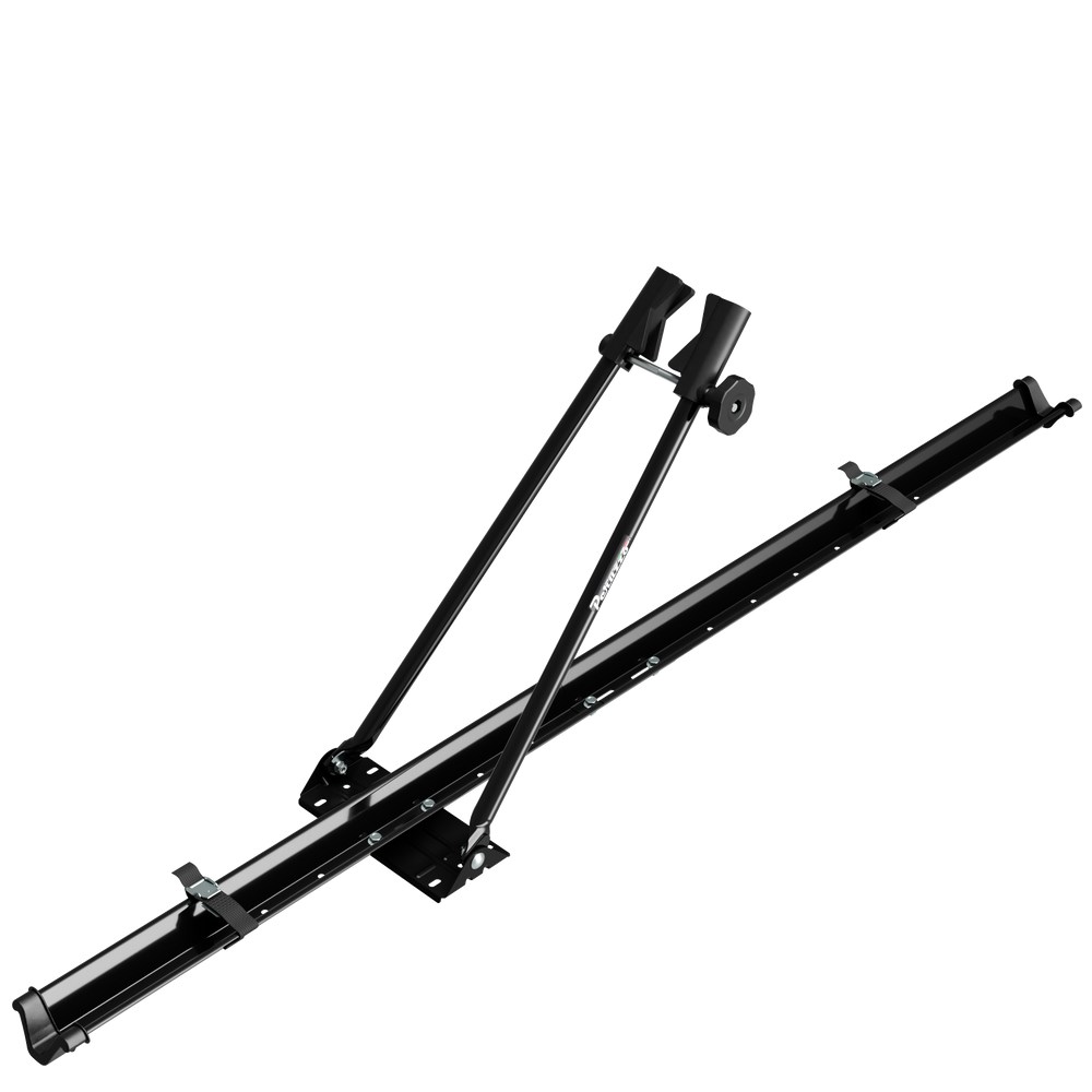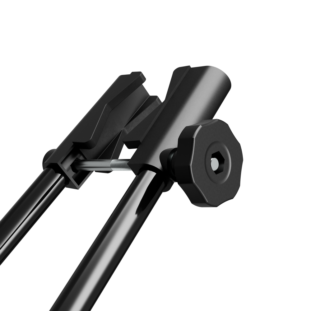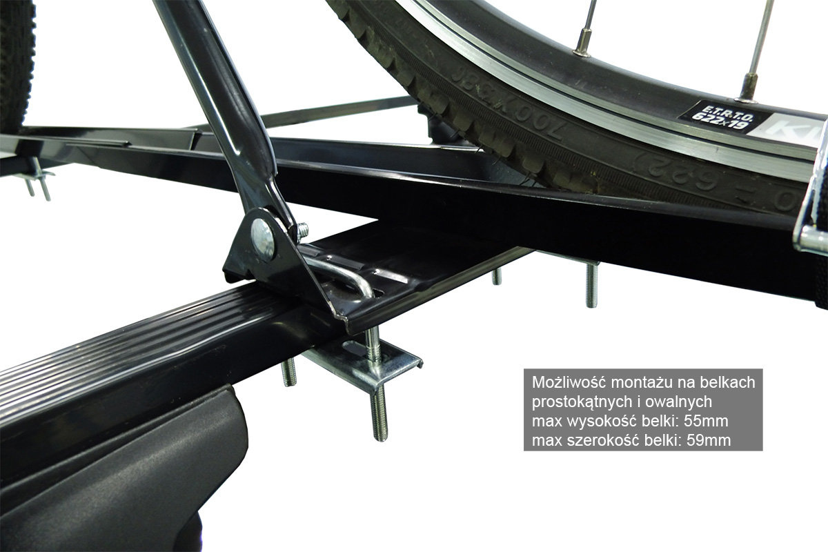 De houder wordt met de meegeleverde klemmen (U-bouten) aan de dakdragers bevestigd. Deze zijn geschikt voor dragers (aluminium en staal) tot 59 mm breed .