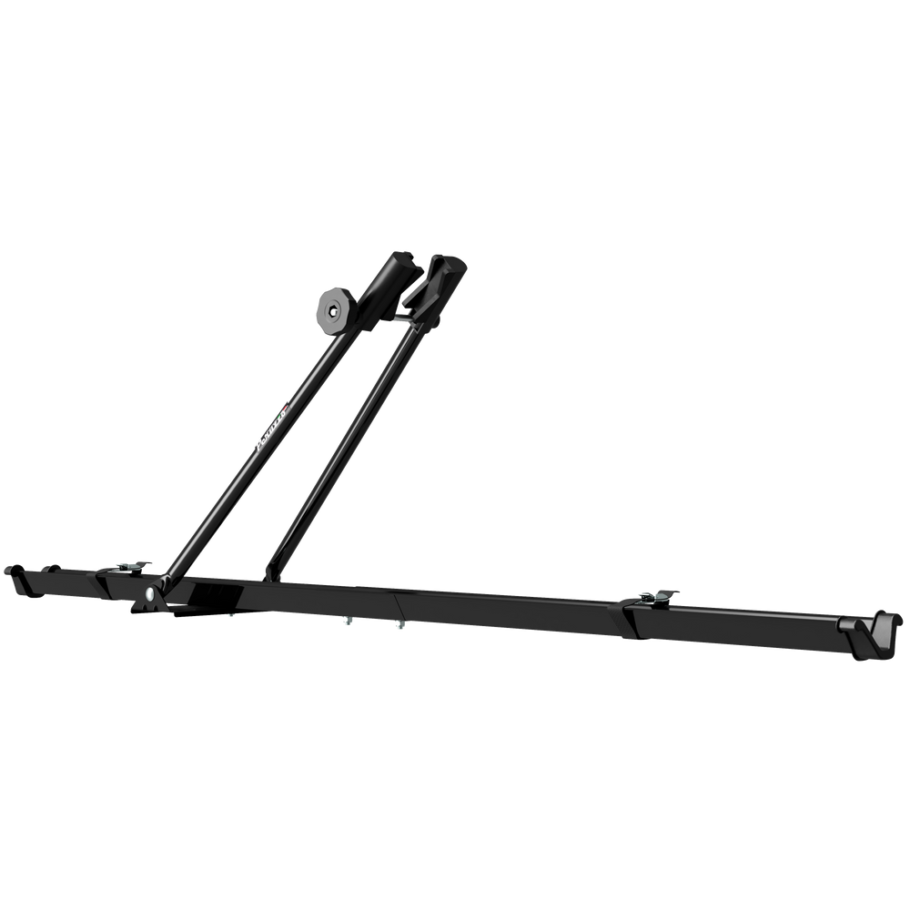 Deze drager bevestigt de fiets op drie punten : het frame en de wielen. De drager is voorzien van een handig slot waarmee het frame in één beweging kan worden vergrendeld. Een diepe gleuf vergemakkelijkt de montage, waardoor de fiets stabieler is tijdens het opstappen en rijden. De sterke stalen constructie zorgt voor stabiliteit en veiligheid . De set wordt geleverd met spanbanden om de wielen van de fiets vast te zetten.