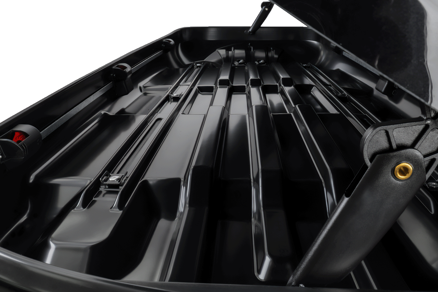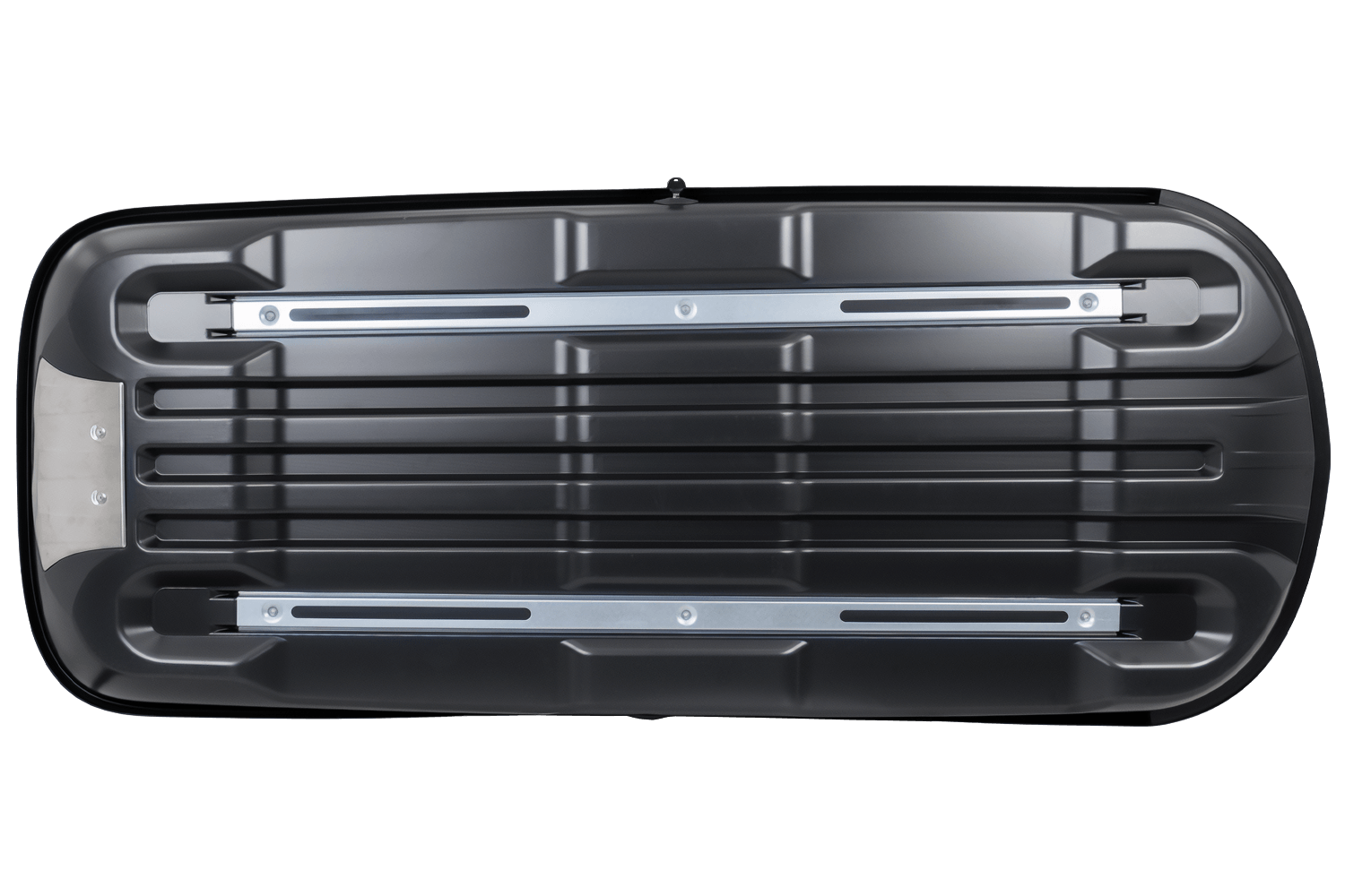 Door de schuifbevestiging in de geleiders kunt u de box aanpassen aan de afstand van de dakdragerbalken van 55 tot 95 cm .