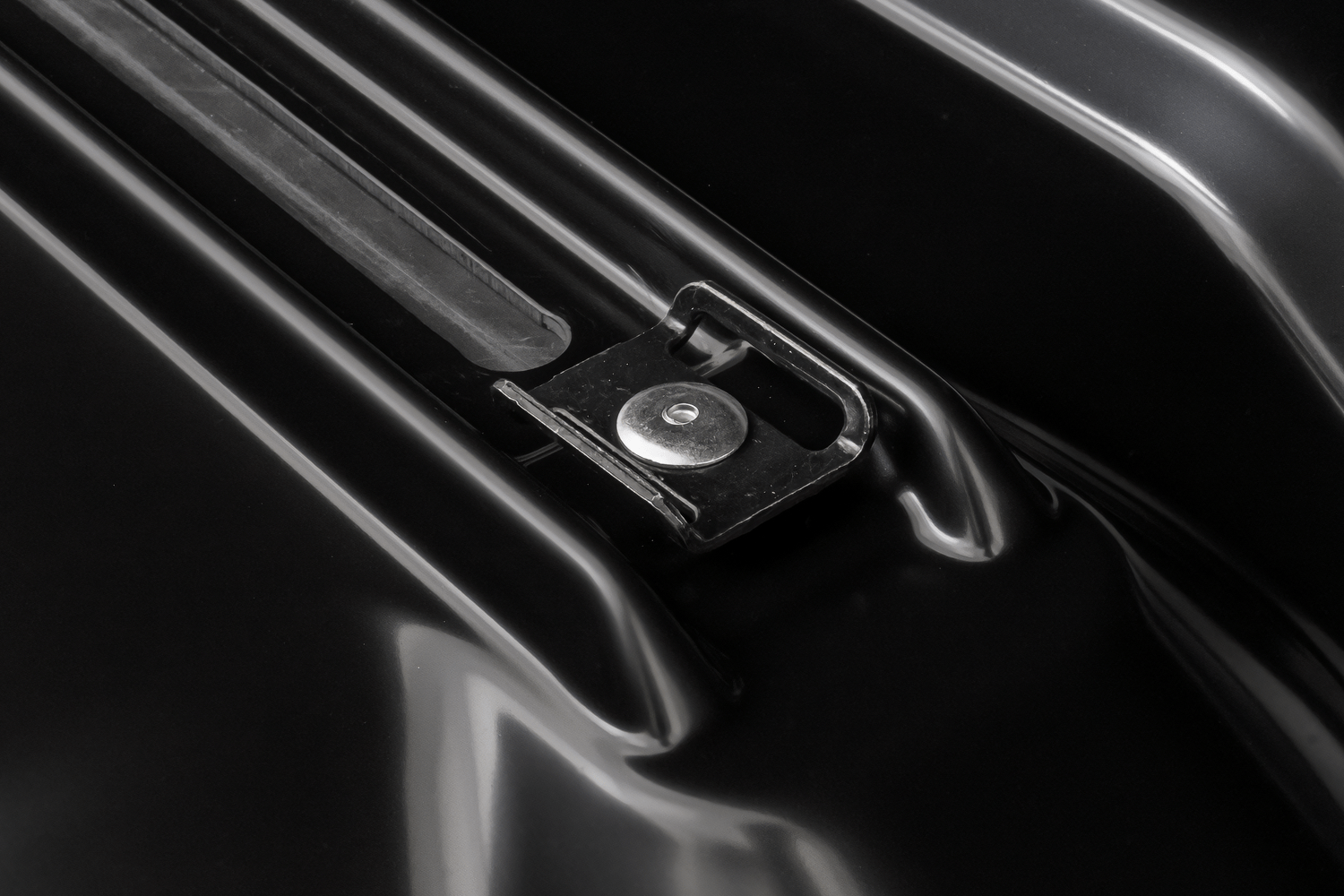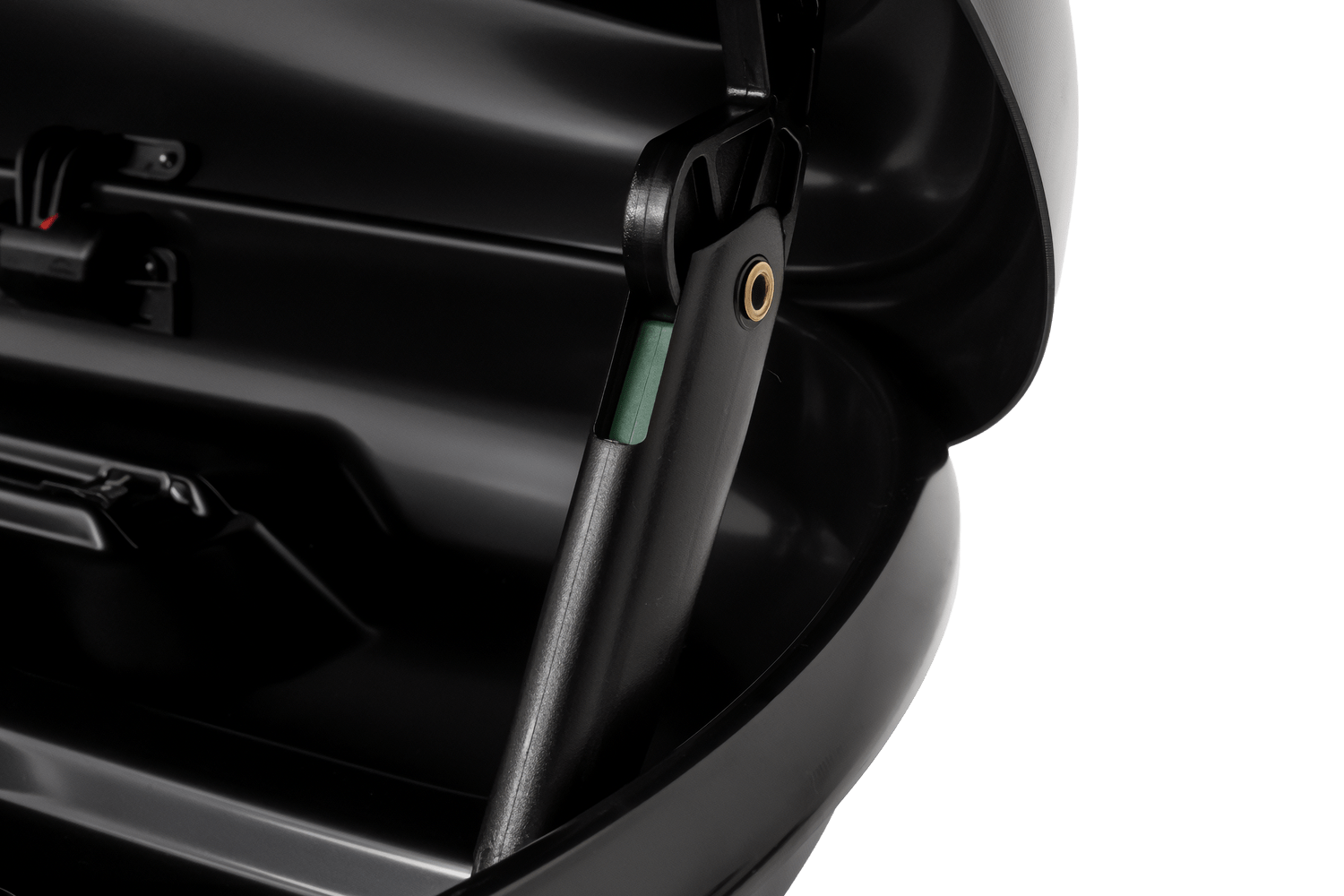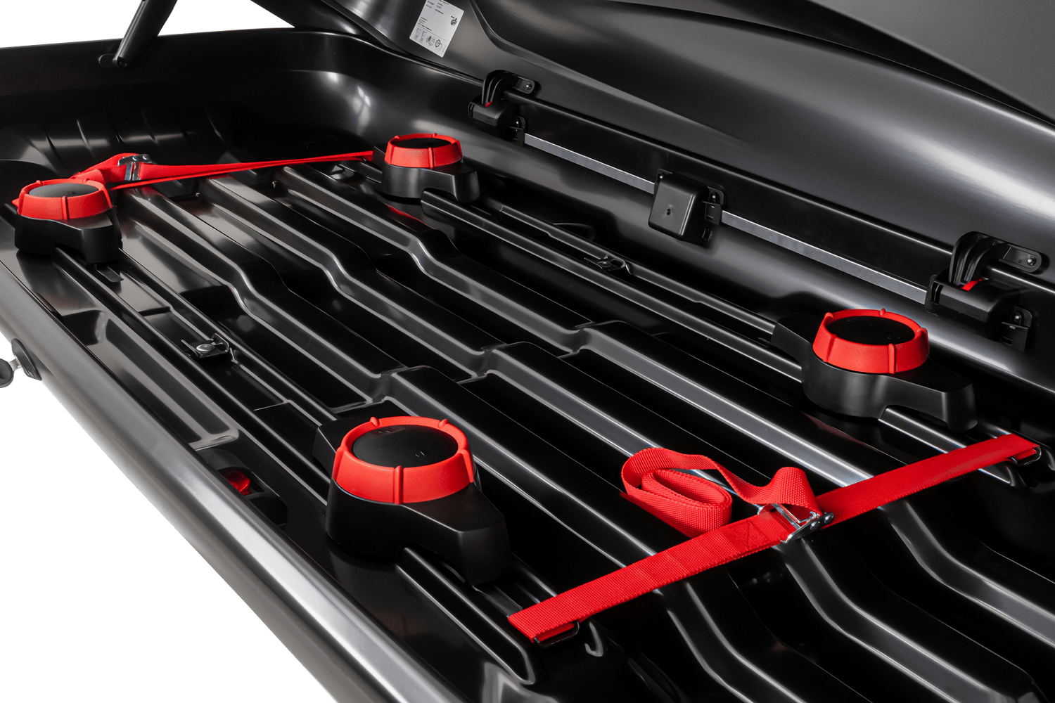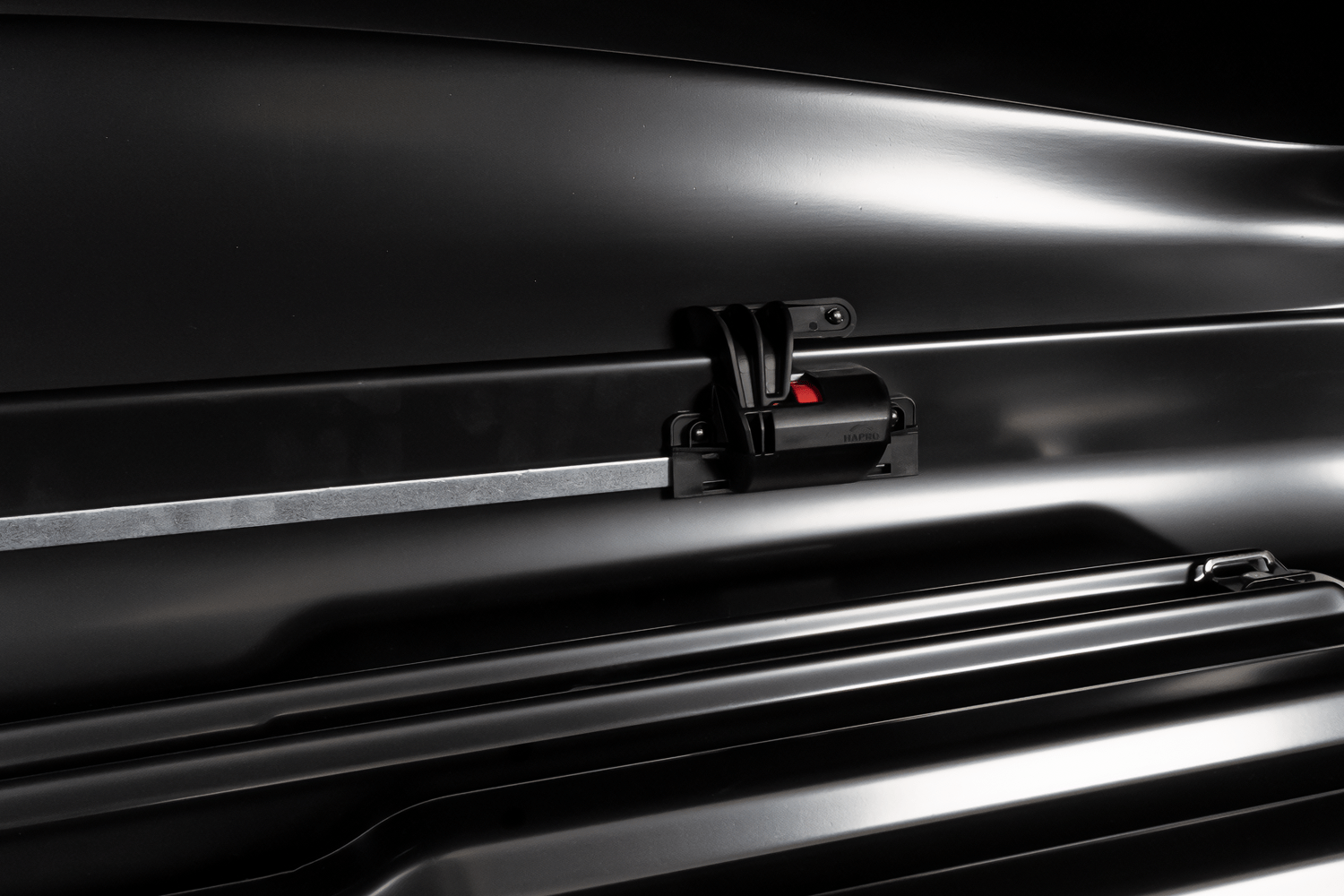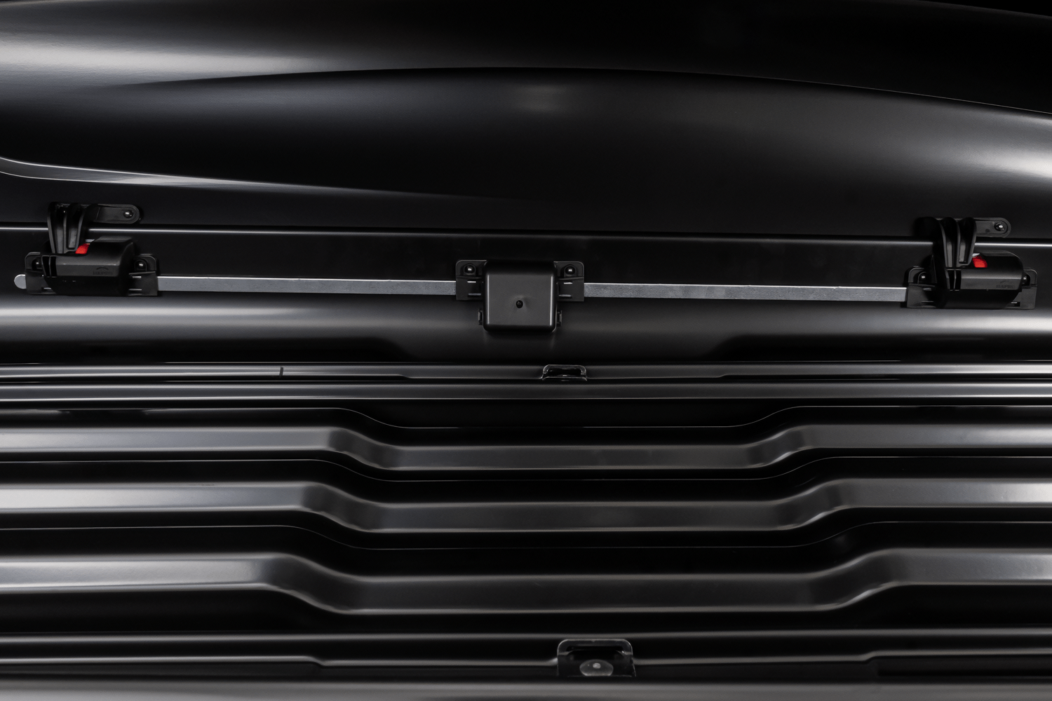 De aerodynamische vorm vermindert het rijgeluid en verlaagt het brandstofverbruik. Het dubbelzijdige openingssysteem vergemakkelijkt de toegang vanaf elke kant van het voertuig, terwijl veerbelaste actuatoren het deksel stabiliseren en de afdichting verbeteren. Een driepuntsvergrendeling vergrendelt de koffer op meerdere plaatsen en de sleutel kan pas worden verwijderd als deze goed gesloten is, wat de veiligheid verhoogt.