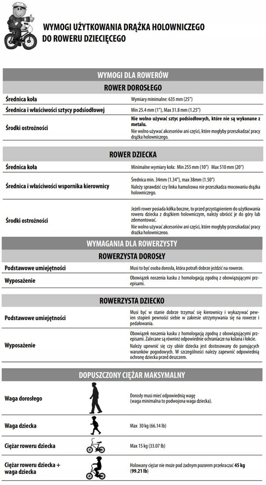 Gewicht van de kinderfiets + gewicht van het kind Rower z dzieckiem Het getrokken gewicht mag onder geen enkele omstandigheid meer dan 45 kg (99,21 lb) bedragen.