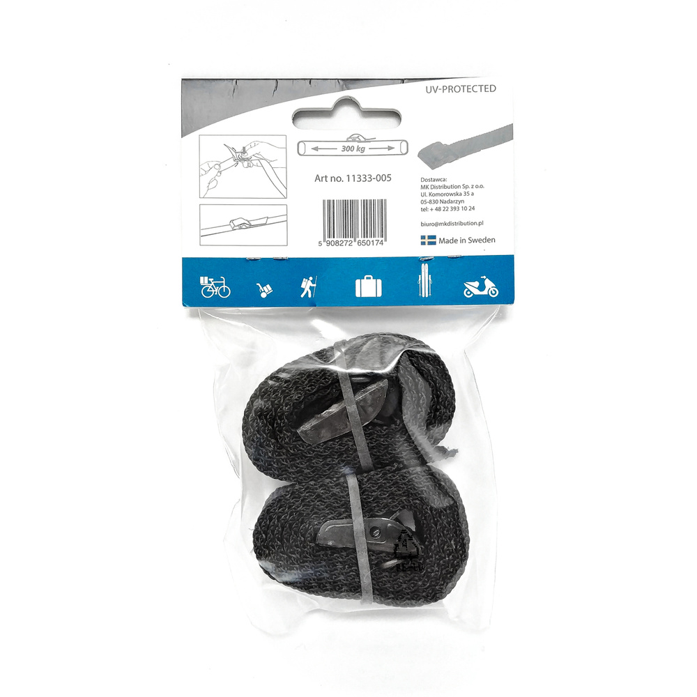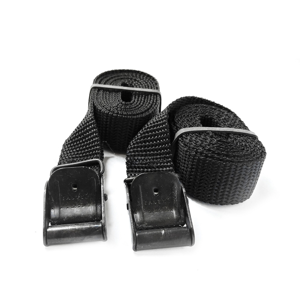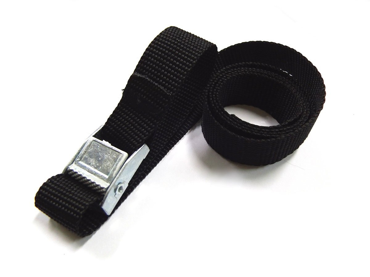 Duurzame textielriemen met metalen gespen , elk 100 cm lang. Ze kunnen worden gebruikt voor het vastzetten van bagage op een dakkoffer, het vastzetten van fietswielen op fietsendragers en voor vele andere doeleinden in huis en werkplaats. Een metalen slot (gesp) zorgt ervoor dat de riem altijd strak blijft zitten.