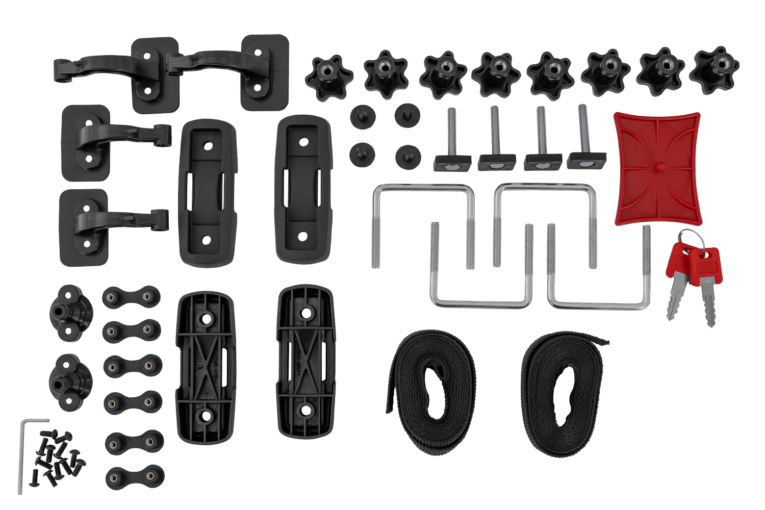 De set bevat textielriemen voor het stevig vastzetten van bagage. De doos wordt plat geleverd en vereist eenvoudige zelfmontage.