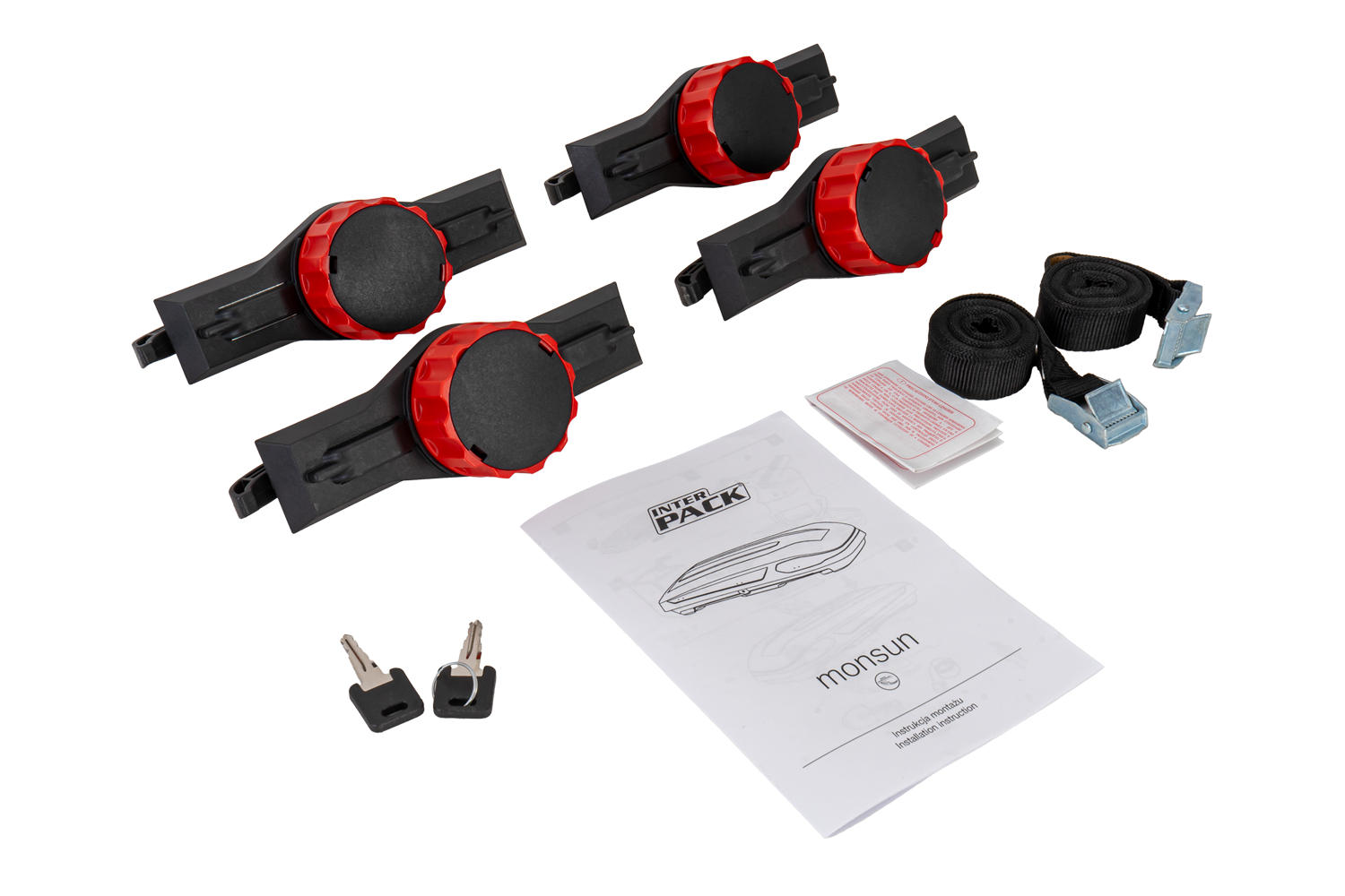 - Inter Pack Monsun M (mat antraciet) – inhoud 470 l, lengte 186 cm, laadvermogen 75 kg, gewicht 16 kg. Geschikt voor koffers, tassen, ski's en snowboards tot 165 cm. Rapid Fit met dynamometer, tweezijdige opening en centrale vergrendeling zorgen voor veili