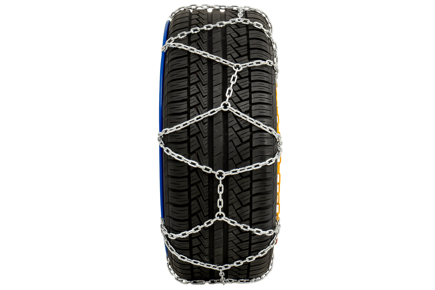 De 12 mm dikke schakels zijn gemaakt van hoogwaardig, gehard staal, wat hun scheur- en slijtvastheid verhoogt en de levensduur van de set verlengt. Een speciaal ruitvormig patroon verbetert de rijstabiliteit , vermindert het risico op zijdelings slippen en verbetert de voertuigcontrole in bochten. Bovendien bijt de vierkante doorsnede van de schakels zich nog beter in het wegdek vast, wat zorgt voor veilig remmen, zelfs op gladde oppervlakken.