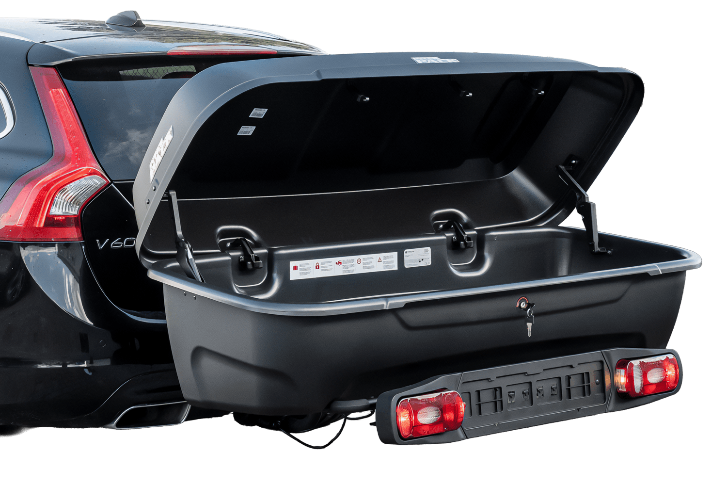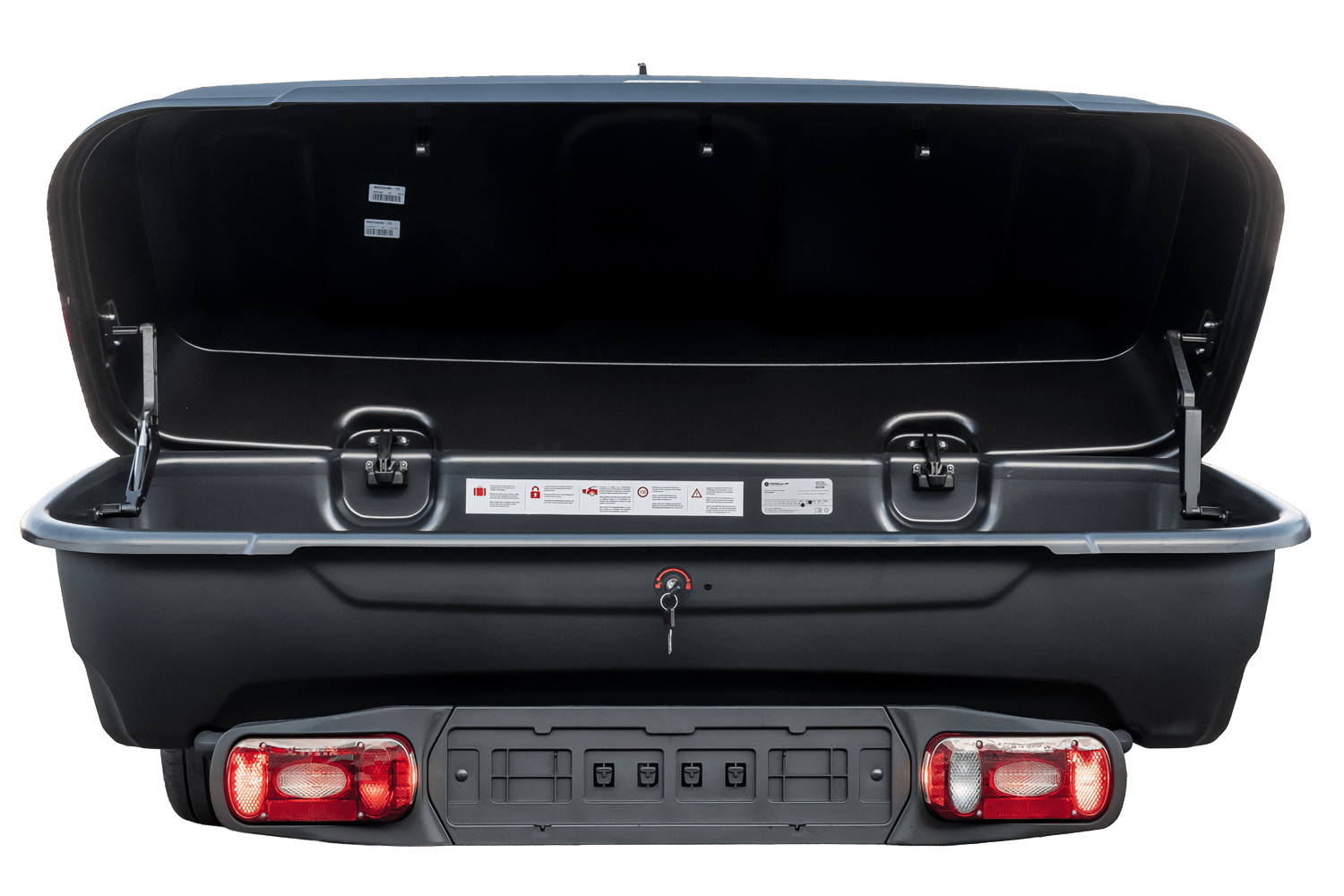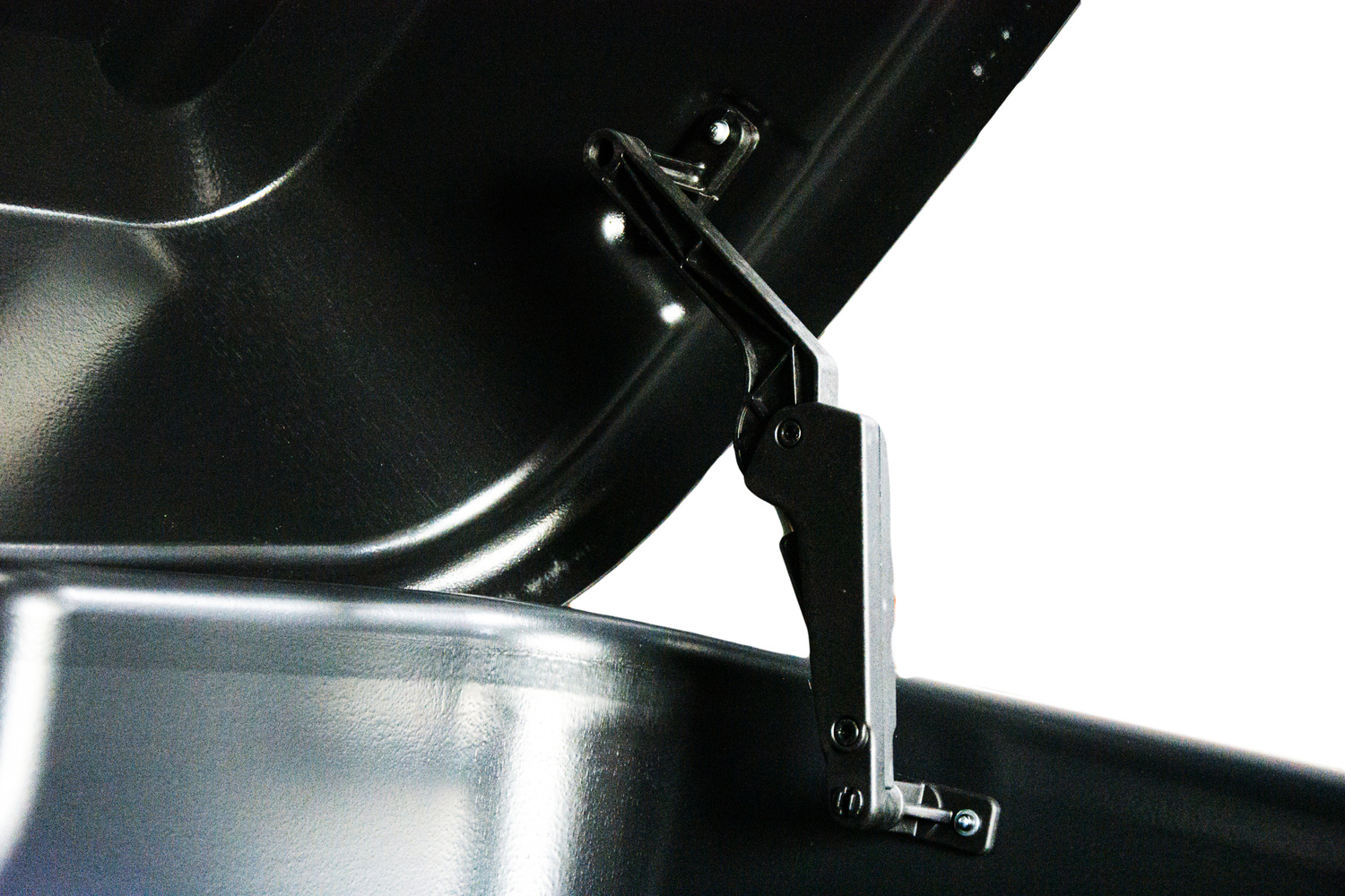 De box wordt met een haak aan het platform bevestigd met stevige U-beugels en vastgezet met een driepuntssluiting. Krachtige actuatoren maken het eenvoudig om het deksel van de box op te tillen.