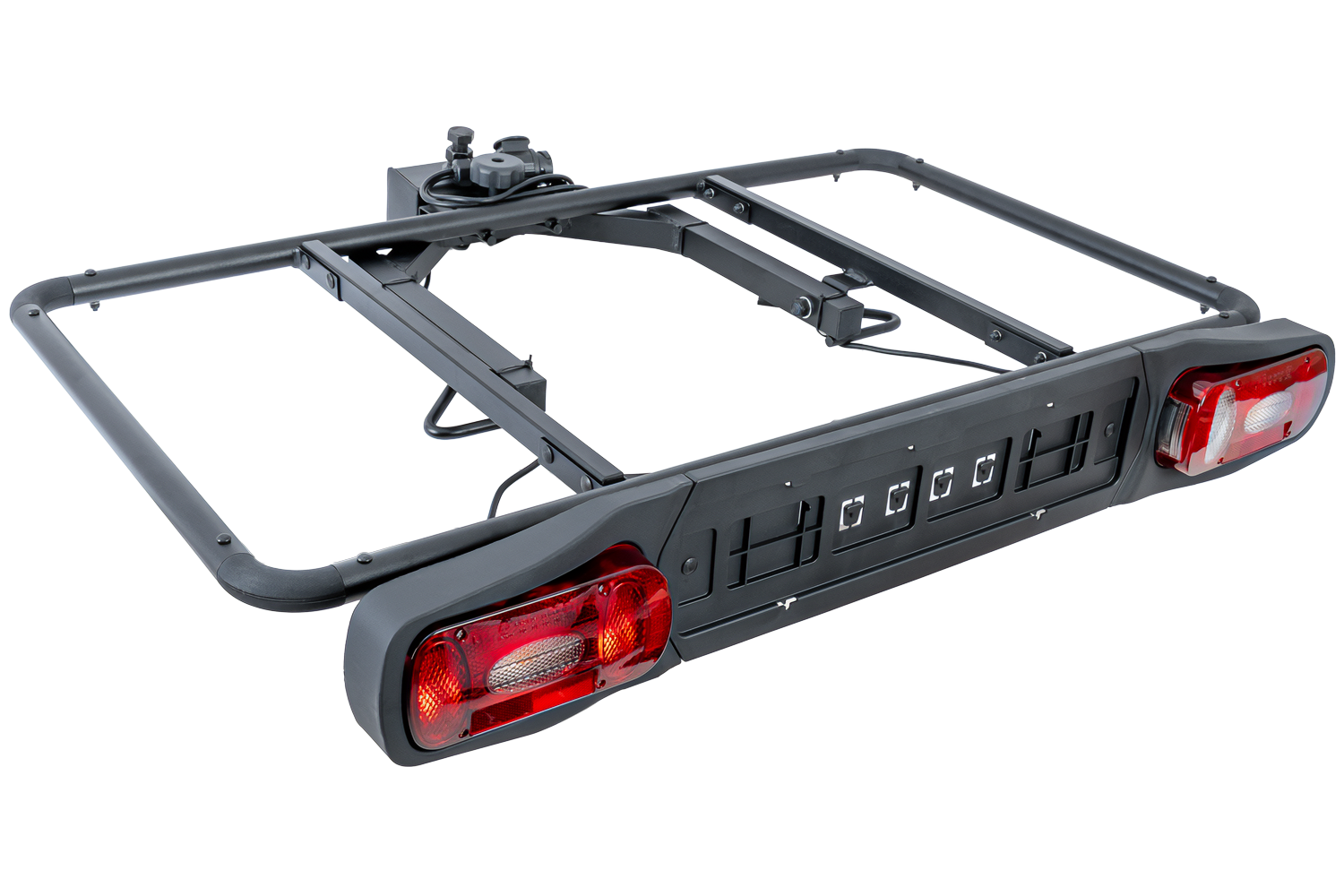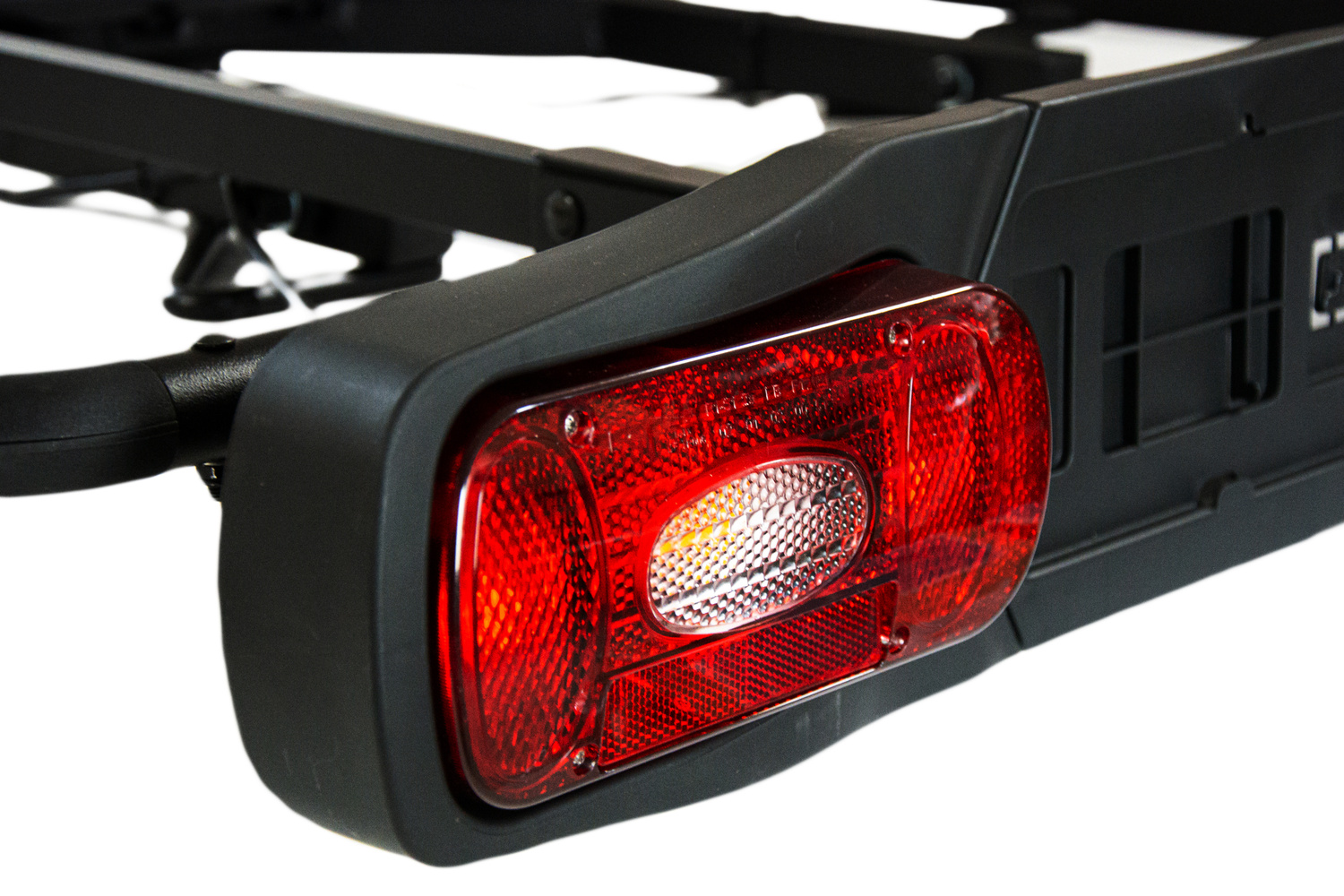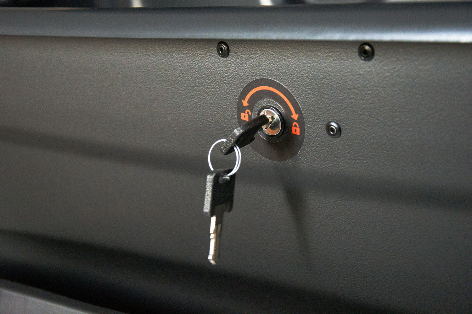 De box wordt met een haak aan het platform bevestigd met stevige U-beugels en vastgezet met een driepuntssluiting. Krachtige actuatoren maken het eenvoudig om het deksel van de box op te tillen.