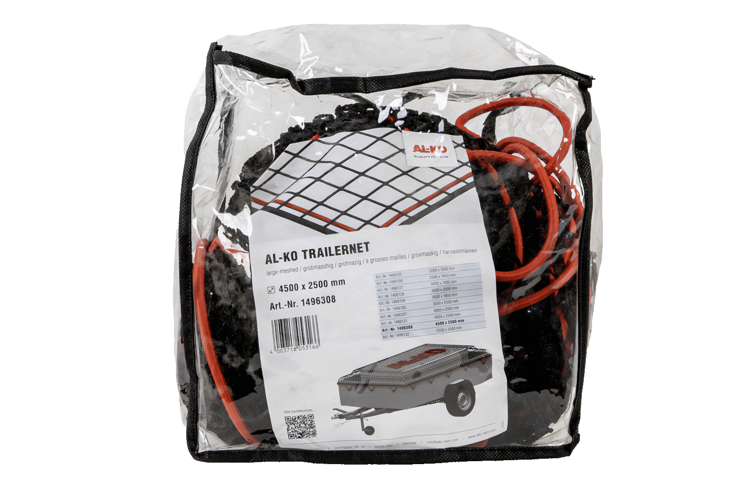 - Het AL-KO 1496308 bagagenet, 2500 x 4500 mm groot, met mazen van 30 x 30 mm en elastisch koord, bevestigt lading op aanhangers. Het is weerbestendig en TÜV SÜD-gecertificeerd, wat kwaliteit en transportveiligheid garandeert.