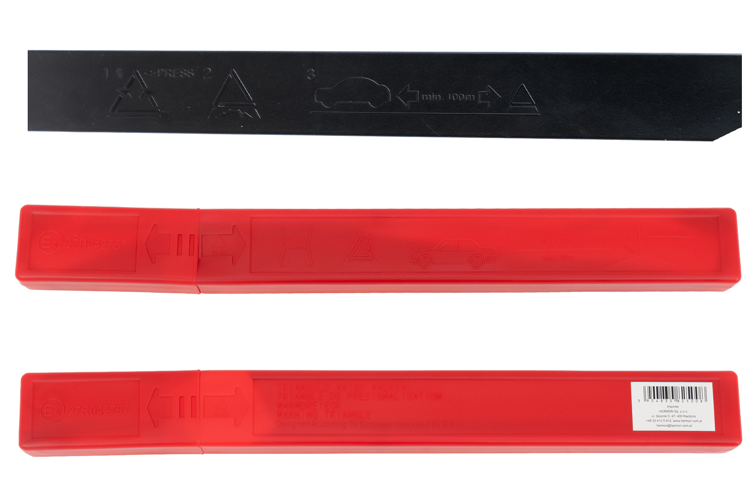 Dankzij de afmetingen van 430x430x430 mm en het reflecterende oppervlak is de driehoek van veraf goed zichtbaar, wat de veiligheid in noodsituaties aanzienlijk verbetert. Het product is E4-gecertificeerd , wat bevestigt dat het voldoet aan de Europese kwaliteits- en veiligheidsnormen.