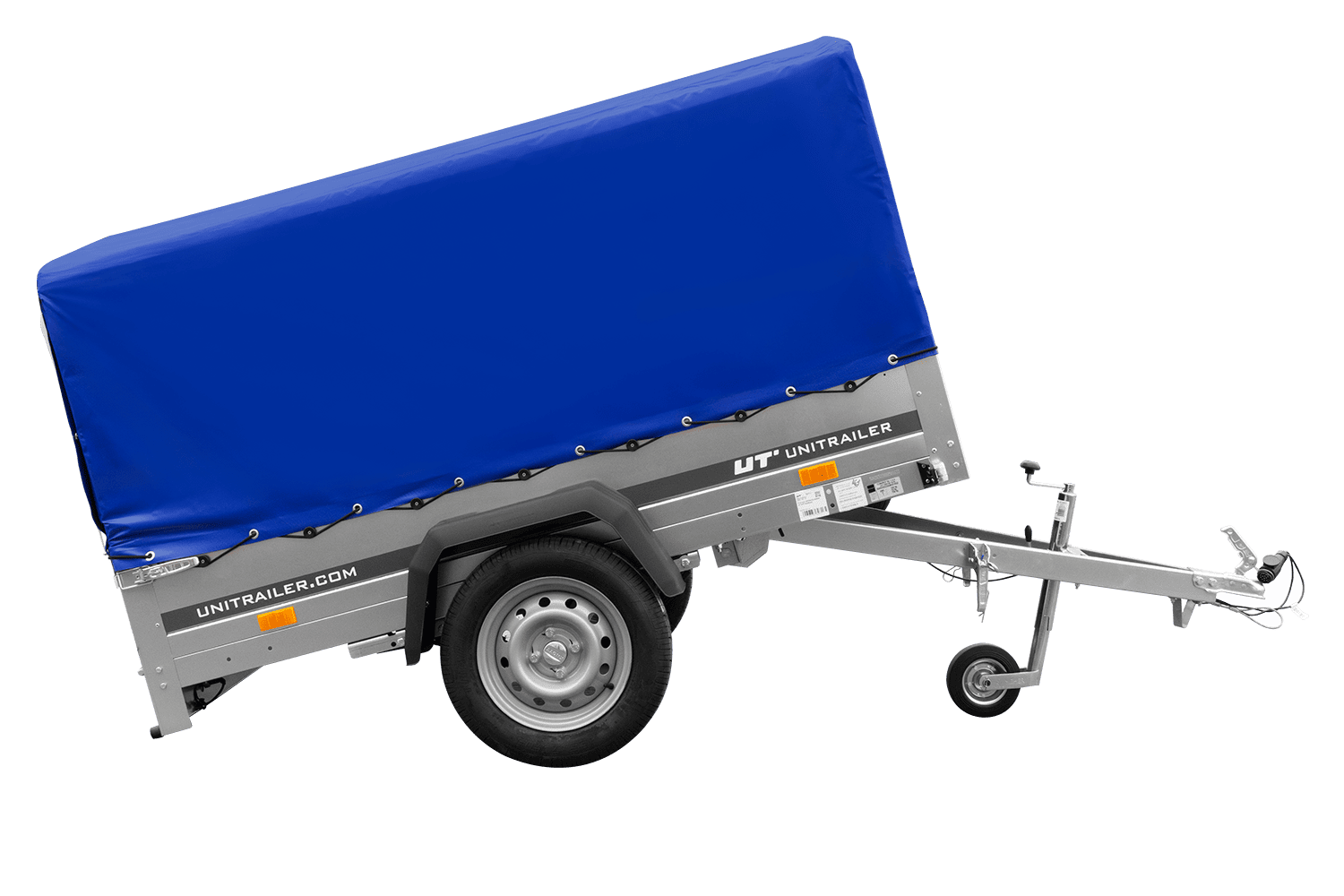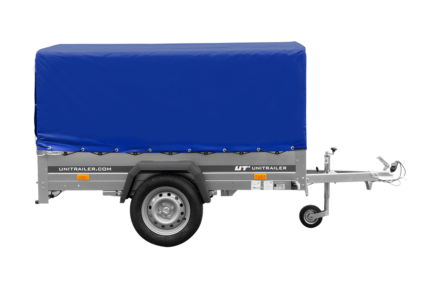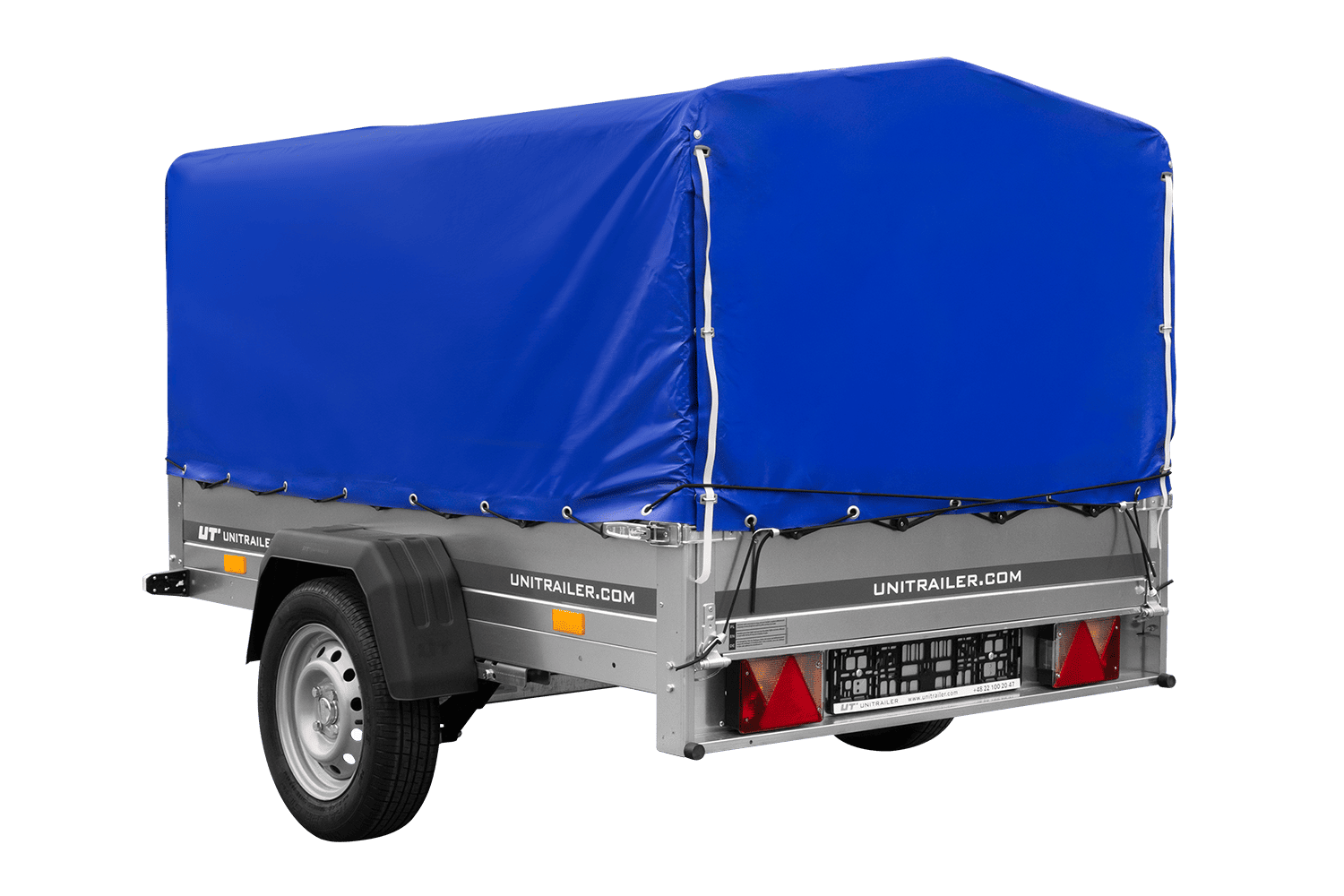 Enkelassige aanhangwagen op veren 200x125 UNITRAILER GARDEN 201/R KIPP met H-800 frame en blauw dekzeil
