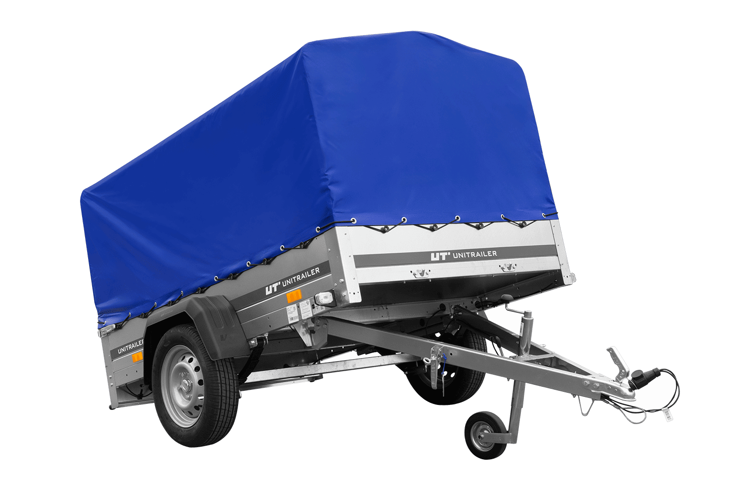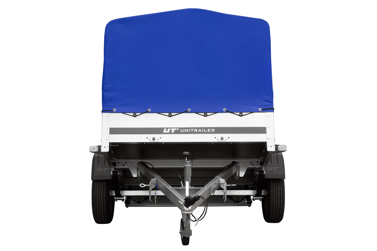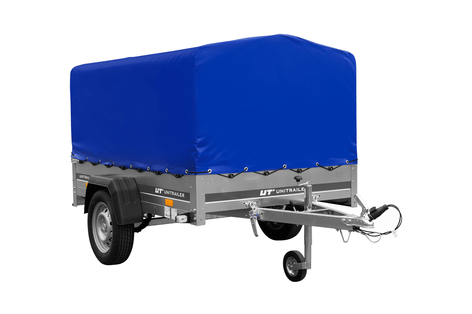 Enkelassige aanhangwagen op veren 200x125 UNITRAILER GARDEN 201/R KIPP met H-800 frame en blauw dekzeil