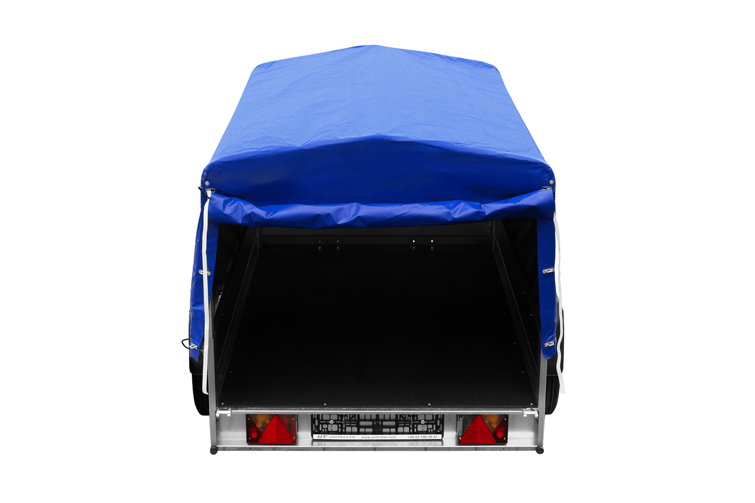 Het frame in de getoonde trailer is 80 cm hoog op het hoogste punt en heeft een puntdak voor een betere water- en sneeuwafvoer tijdens het rijden. Het is gemaakt van zeer solide stalen balken die tegen roest zijn beschermd door verzinking. Het frame wordt gemonteerd met schroeven, die in de set zijn inbegrepen. Dit creëert een sterk en stabiel frame voor het zeil. Het zeil is gemaakt van dik, waterdicht materiaal en zelfs langdurige regenval zal het niet laten lekken. Een elastisch koord met haken is ook inbegrepen voor snel spannen. Het zeil heeft een openend achtergedeelte , waardoor het gemakkelijk is om goederen in en uit de trailer te laden. U hoeft niet het hele zeil te verwijderen om toegang te krijgen tot uw lading. Til eenvoudig de twee banden op die het achterste gedeelte van het zeil vastzetten tegen ongewenst optillen tijdens het rijden of parkeren. Rol het vervolgens eenvoudig op en plaats het op de bovenste balk van het frame. Op deze manier heeft u gemakkelijk toegang tot de binnenkant van de trailer zonder zelfs de achterkant te hoeven openen.