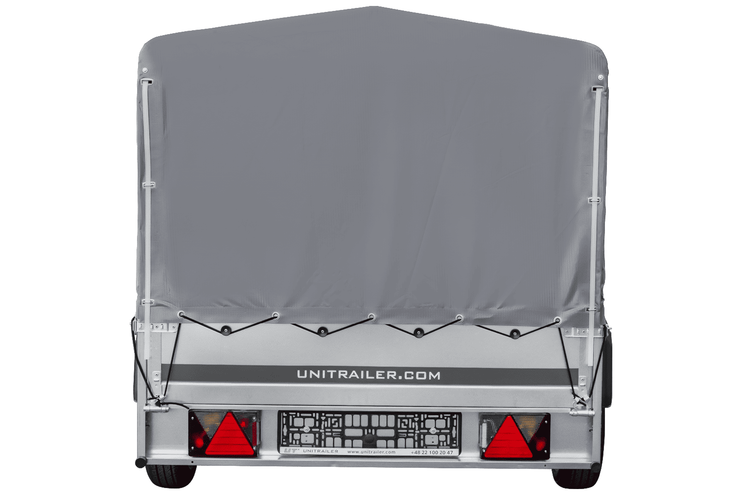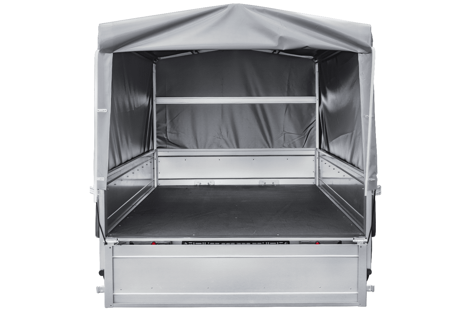 Het frame in de getoonde trailer is 80 cm hoog op het hoogste punt en heeft een puntdak voor een betere water- en sneeuwafvoer tijdens het rijden. Het is gemaakt van zeer solide stalen balken die tegen roest zijn beschermd door verzinking. Het frame wordt gemonteerd met schroeven, die in de set zijn inbegrepen. Dit creëert een sterk en stabiel frame voor het zeil. Het zeil is gemaakt van dik, waterdicht materiaal en zelfs langdurige regenval zal het niet laten lekken. Een elastisch koord met haken is ook inbegrepen voor snel spannen. Het zeil heeft een openend achtergedeelte , waardoor het gemakkelijk is om goederen in en uit de trailer te laden. U hoeft niet het hele zeil te verwijderen om toegang te krijgen tot uw lading. Til eenvoudig de twee banden op die het achterste gedeelte van het zeil vastzetten tegen ongewenst optillen tijdens het rijden of parkeren. Rol het vervolgens eenvoudig op en plaats het op de bovenste balk van het frame. Op deze manier heeft u gemakkelijk toegang tot de binnenkant van de trailer zonder zelfs de achterkant te hoeven openen.