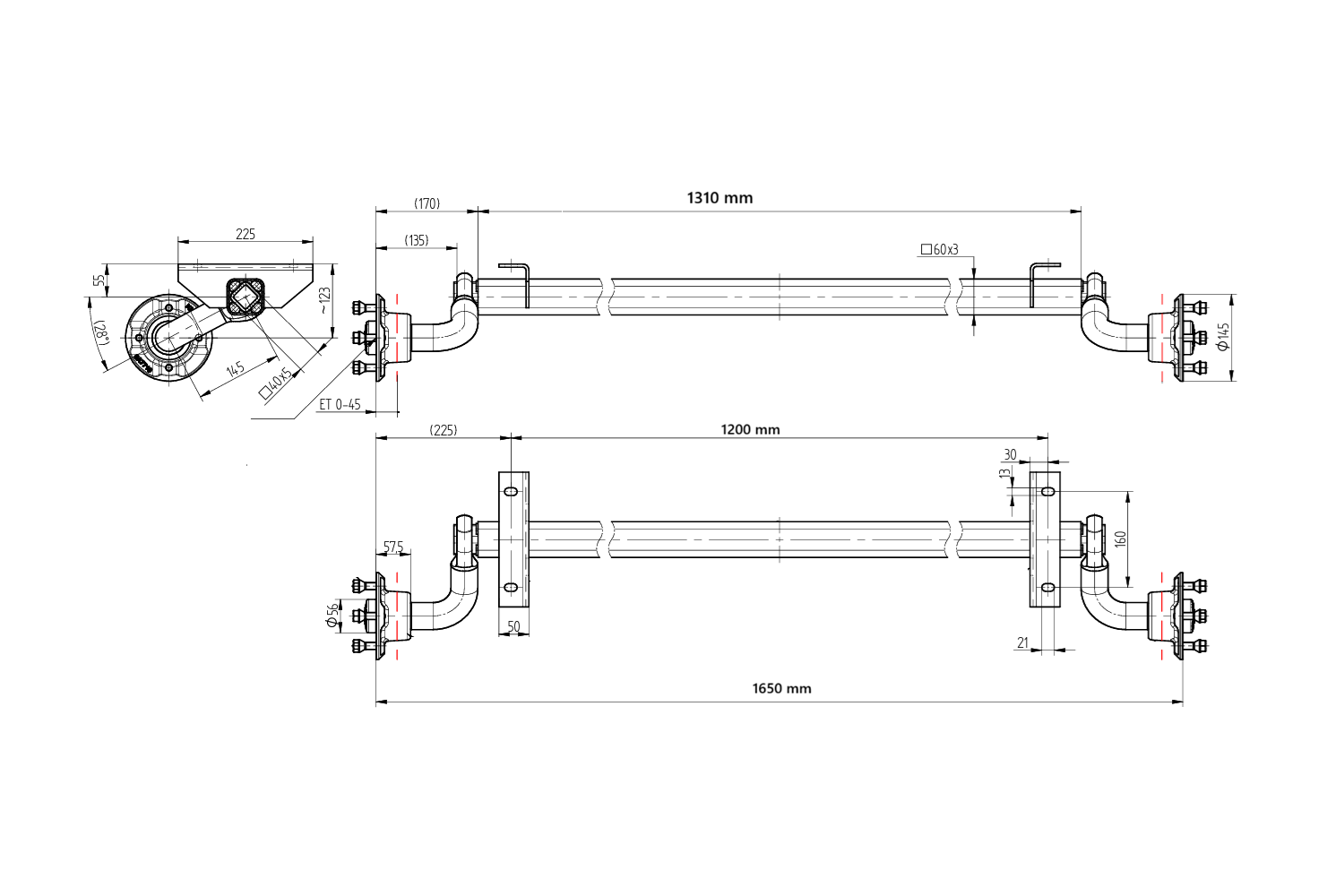 De KNOTT 6A8709.001 ongeremde as is ontworpen voor lichte aanhangwagens met een maximaal laadvermogen van 750 kg . De montagegaten hebben een afstand van 1200 mm en de naafafstand is 1650 mm , waardoor eenvoudige montage op een breed scala aan voertuigen mogelijk is. Het standaard 4x100 boutpatroon garandeert compatibiliteit met de meeste wielen die op de markt verkrijgbaar zijn. De lengte van de zwenkarm is 145 mm , wat zorgt voor stabiliteit en optimale schokdemping, waardoor de rijveiligheid wordt verhoogd, zelfs bij volledige belading.