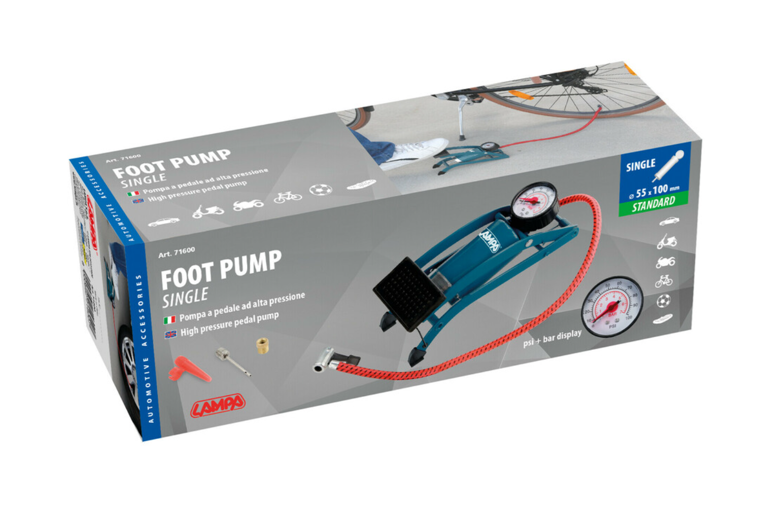 • Deze voetpomp met één cilinder is een duurzaam en veelzijdig hulpmiddel voor het oppompen van banden, ballen en luchtbedden. De stalen cilinder garandeert duurzaamheid, terwijl diverse hulpstukken het toepassingsbereik vergroten.