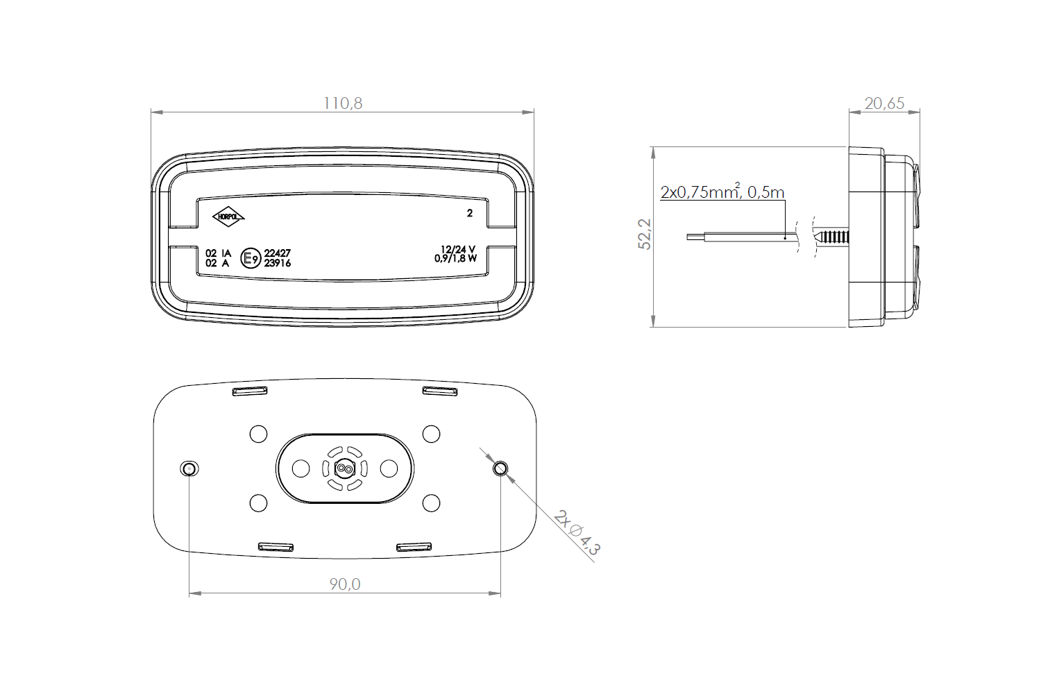 De LD 2761 LED-markeringslamp van HORPOL, ontworpen voor montage aan zowel de linker- als de rechterkant van het voertuig , is 110,8 mm breed, 52,2 mm hoog en 20,65 mm diep . Ontworpen om te werken binnen een spanningsbereik van 12-24 V , is hij geschikt voor gebruik op aanhangwagens, landbouwmachines, vrachtwagens en sleepwagens, wat zijn veelzijdigheid benadrukt. Uitgerust met een platte kabel van 0,5 m , maakt hij een snelle en eenvoudige installatie mogelijk. Dankzij LED-technologie biedt de lamp hoge prestaties, duurzaamheid en energie-efficiëntie, wat de veiligheid in verschillende wegomstandigheden garandeert. De lampbehuizing maakt installatie zonder zichtbare bevestigingsmiddelen mogelijk.