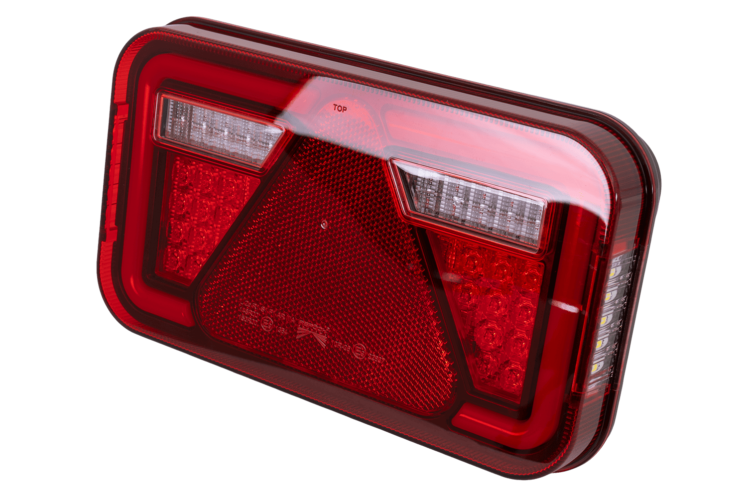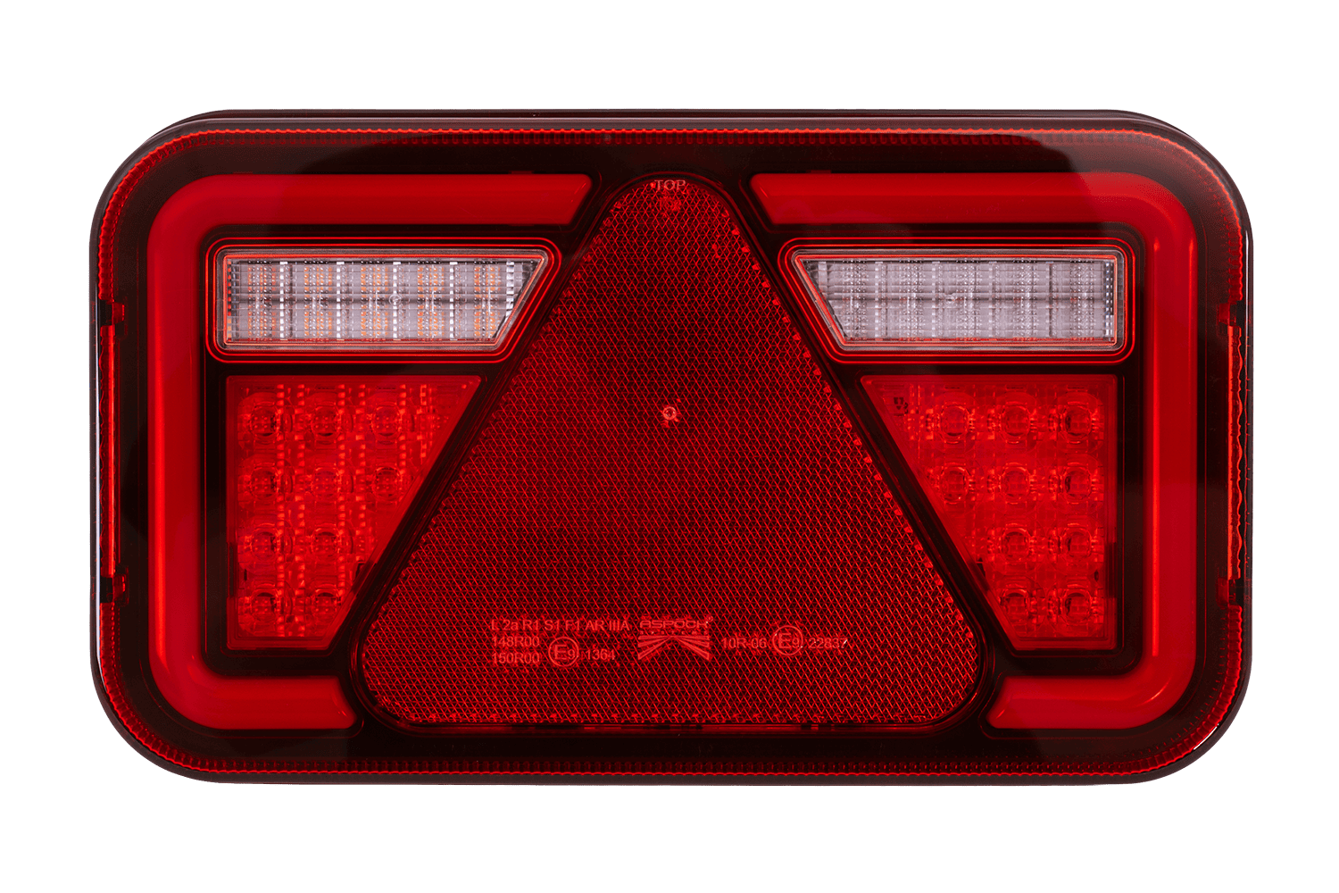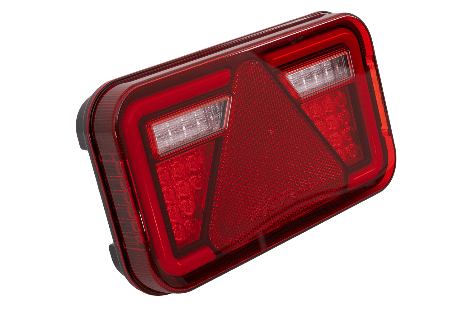 - Het MULTILED IV ASPÖCK achterlicht is ontworpen voor montage aan de linkerkant. Het biedt zes functies: positielicht, remlicht, mistlicht, richtingaanwijzer, kentekenplaatverlichting en een reflecterende driehoek.
