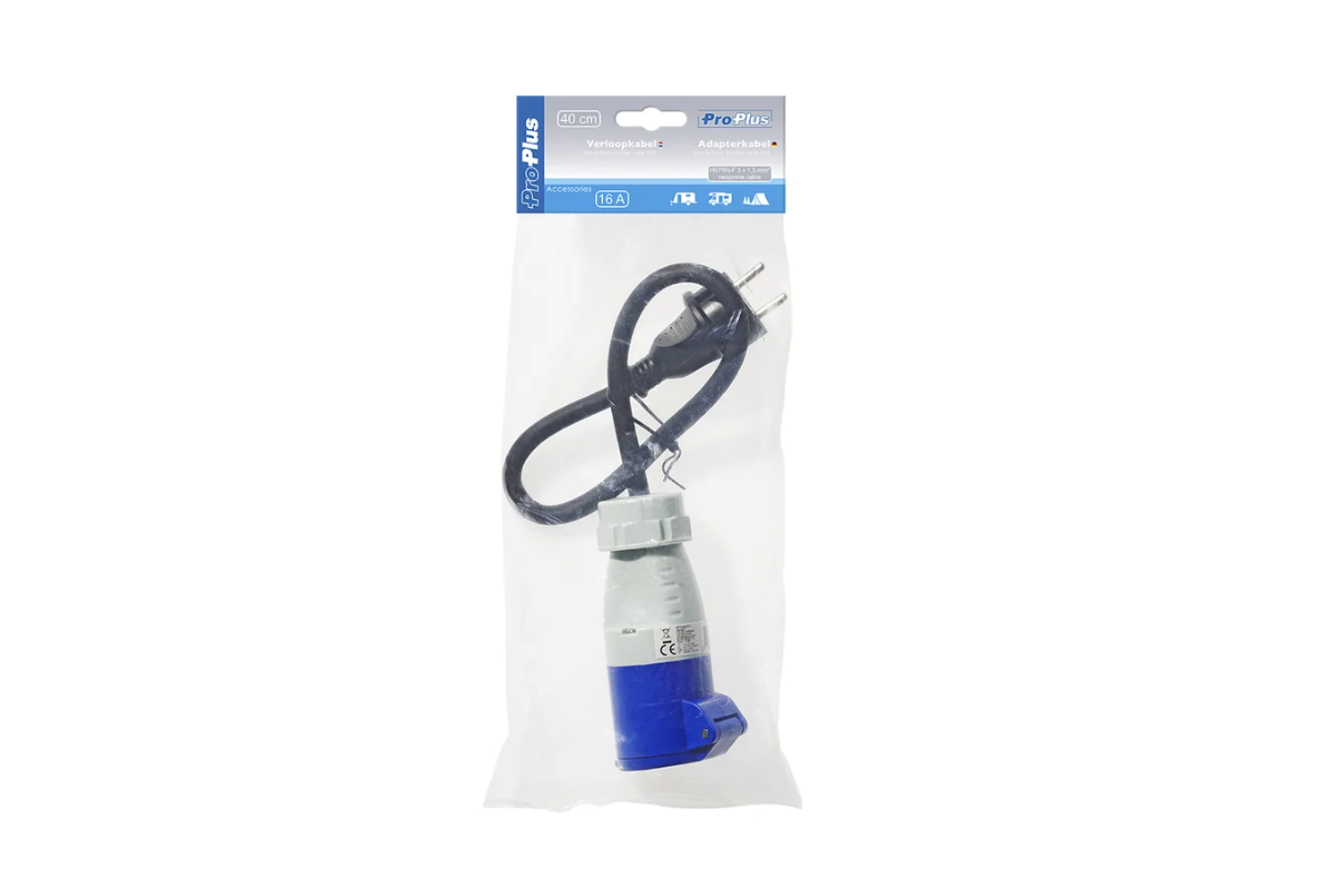 - De ProPlus CEE/SCHUKO 16A 230V stopcontactadapter is een hoogwaardige kabel van 40 cm voor campers en caravans. Gemaakt van duurzaam neopreen, is hij weerbestendig en ontworpen voor veilig gebruik op campings.