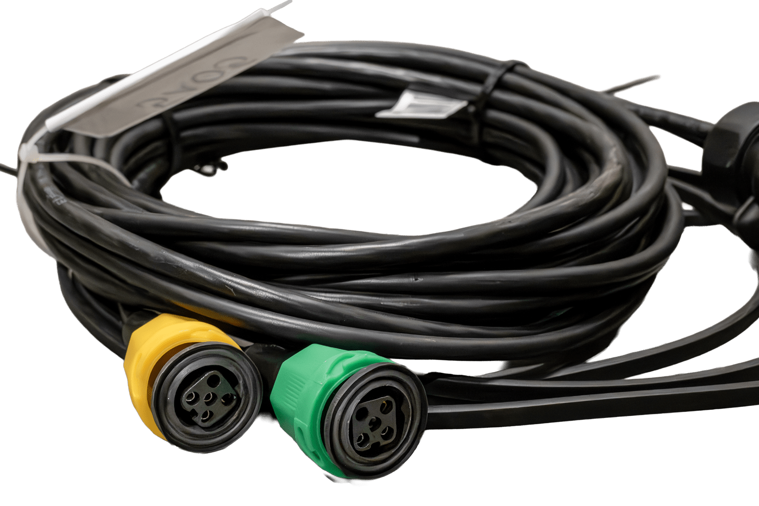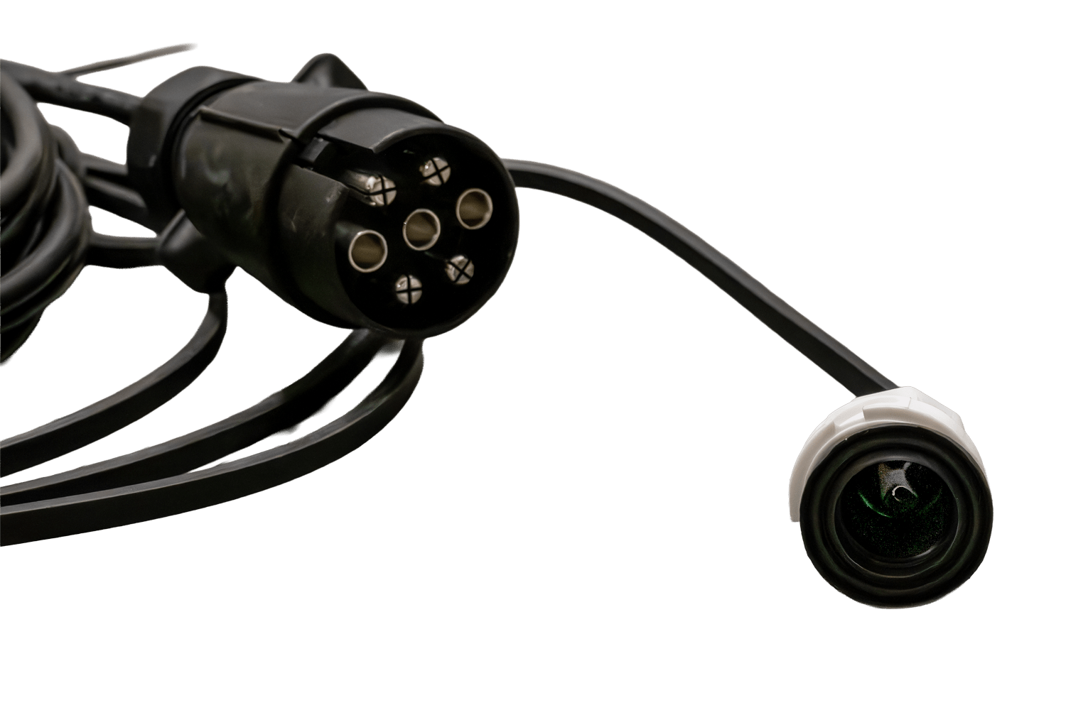 De kabelboom is voorzien van twee AJ.BA 5-pins bajonetconnectoren en twee AJ.BA 2-pins bajonetconnectoren voor het aansluiten van de achterlichten. Het bajonetsysteem zorgt voor een snelle en veilige installatie, waardoor het risico op onbedoelde loskoppeling tijdens het rijden wordt geëlimineerd. Het ontwerp van de connectoren garandeert een waterdichte verbinding en beschermt de contacten tegen corrosie, wat een langdurige en probleemloze werking van het gehele verlichtingssysteem van de trailer garandeert.