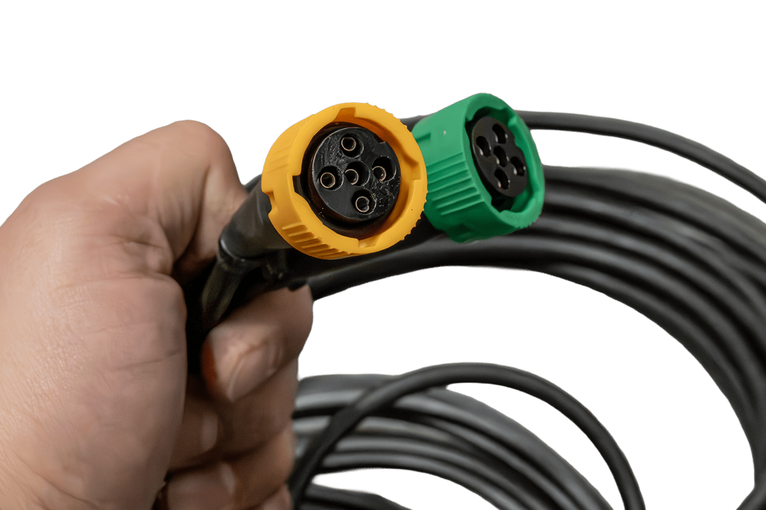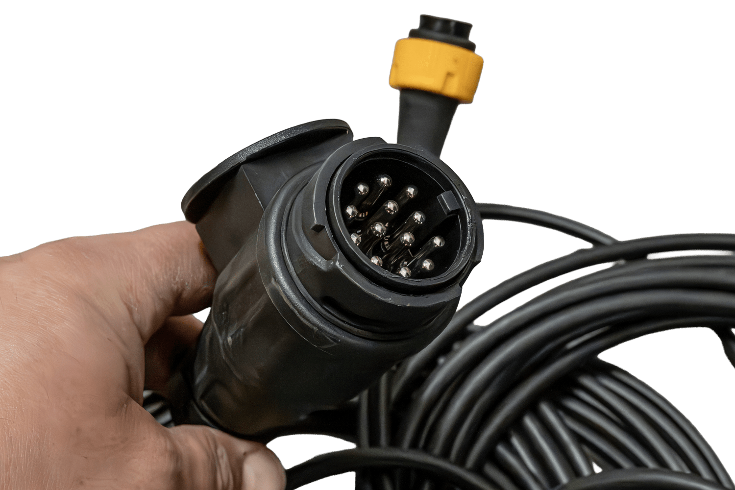 De kabelboom is voorzien van twee 5-pins bajonetconnectoren voor het aansluiten van de achterlichten. Het bajonetsysteem zorgt voor een snelle en veilige installatie, waardoor het risico op onbedoelde loskoppeling tijdens het rijden wordt geëlimineerd. Het ontwerp van de connector garandeert een waterdichte verbinding en beschermt de contacten tegen corrosie, wat een langdurige en probleemloze werking van het gehele verlichtingssysteem van de trailer garandeert.