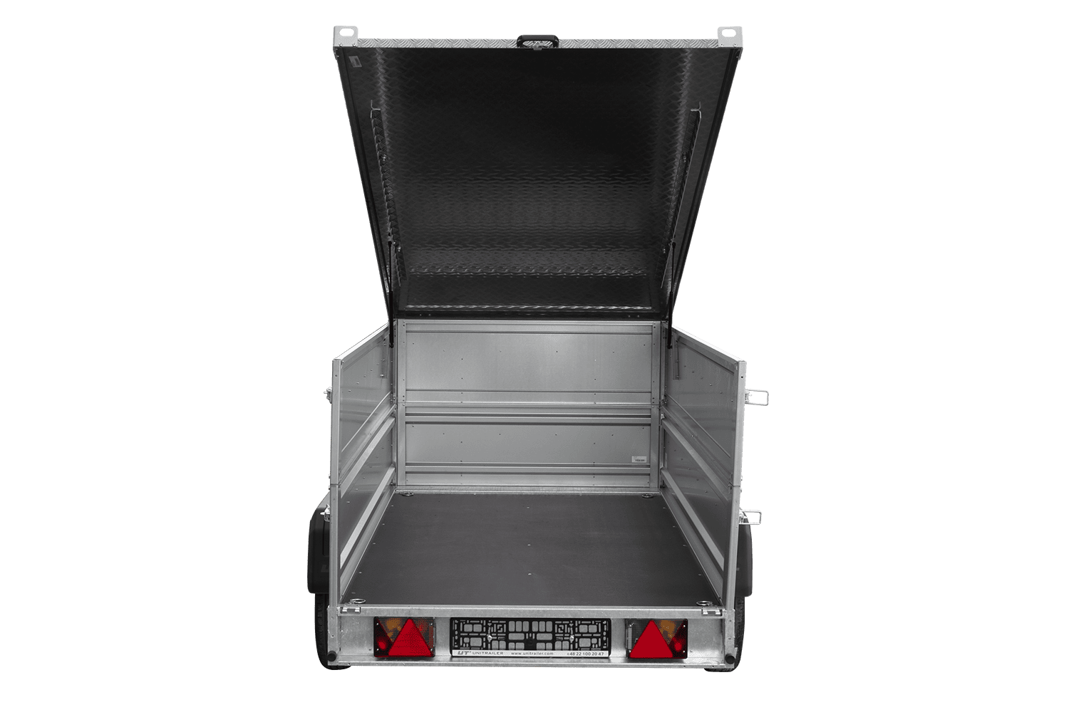 De voor-, achter- en zijpanelen zijn volledig afneembaar , waardoor de trailer snel kan worden omgevormd tot een functioneel transportplatform . Dit is een enorm voordeel bij het vervoeren van lange en onregelmatig gevormde ladingen, zoals planken, balken, OSB-platen, buizen of constructie-elementen. Eén trailer biedt meerdere toepassingen, waardoor de aanschaf van extra apparatuur overbodig is. Voor nog meer ladingbeveiliging is de trailer uitgerust met vier sjorbanden op de vloer . Deze bevestigen de lading stevig met transportriemen, waardoor deze niet verschuift tijdens het transport. Dit is vooral belangrijk bij het vervoeren van zware of onregelmatig gevormde voorwerpen.