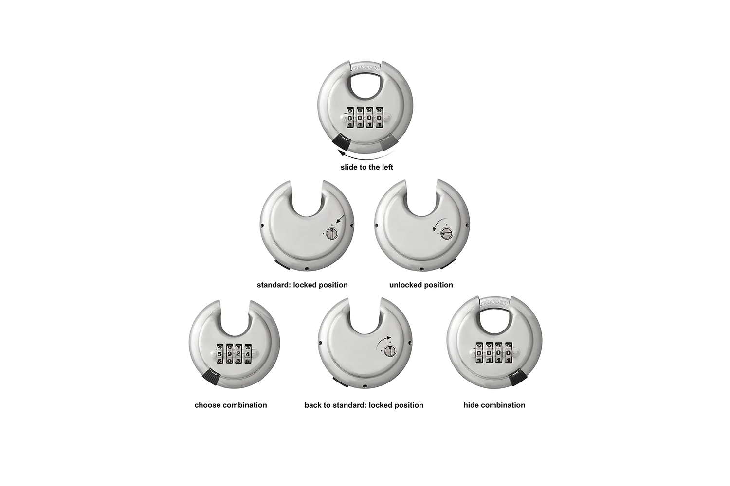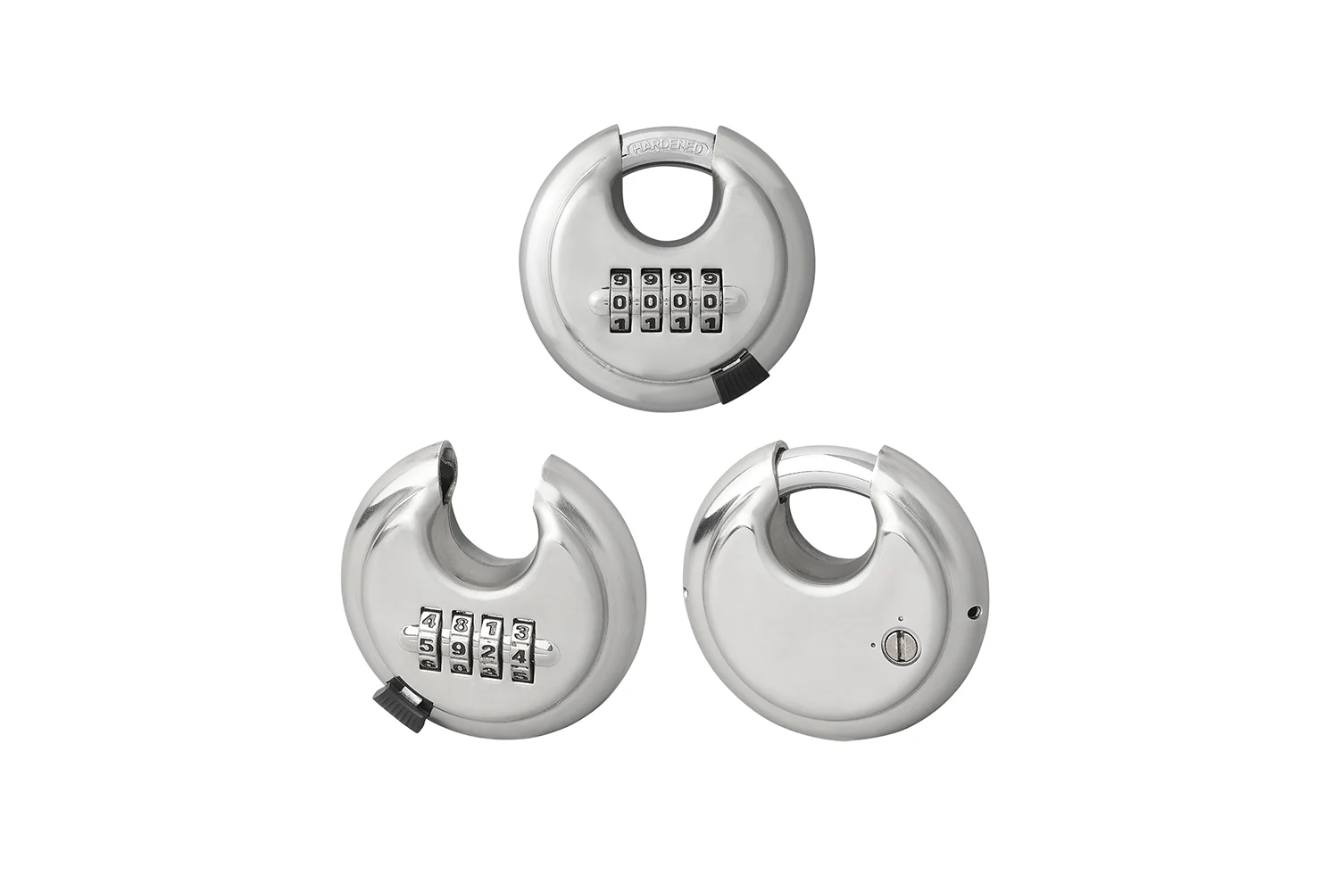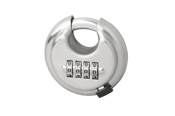 - Constructie - schijfvormig hangslot gemaakt van duurzaam, versterkt staal.