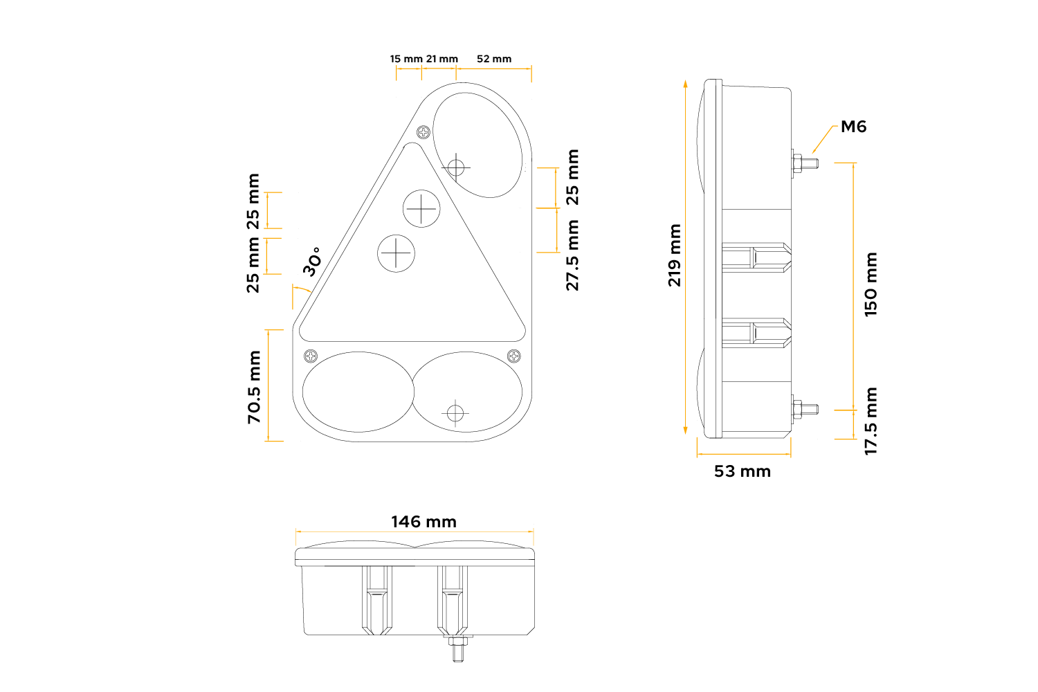 Het Earpoint III achterlicht van ASPÖCK is bedoeld voor montage aan de rechterkant van het voertuig en heeft de volgende afmetingen: breedte 146 mm, hoogte 219 mm, diepte 53 mm . Uitgerust met een 5-polige bajonetaansluiting , waardoor een eenvoudige en snelle installatie mogelijk is in aanhangwagens, bussen en takelwagens .