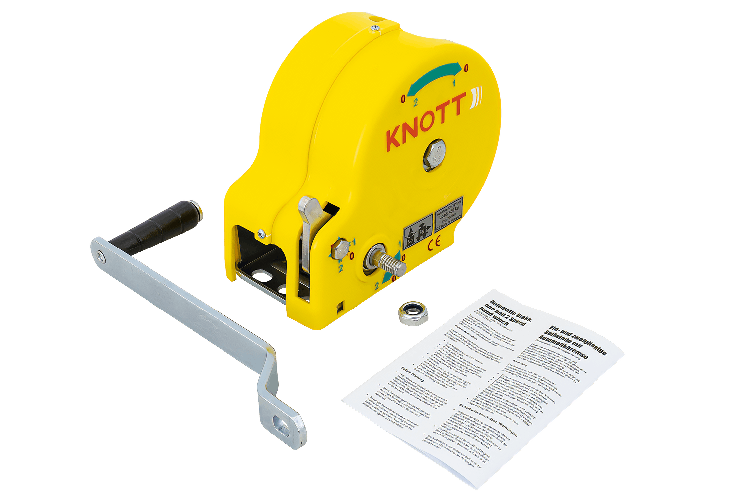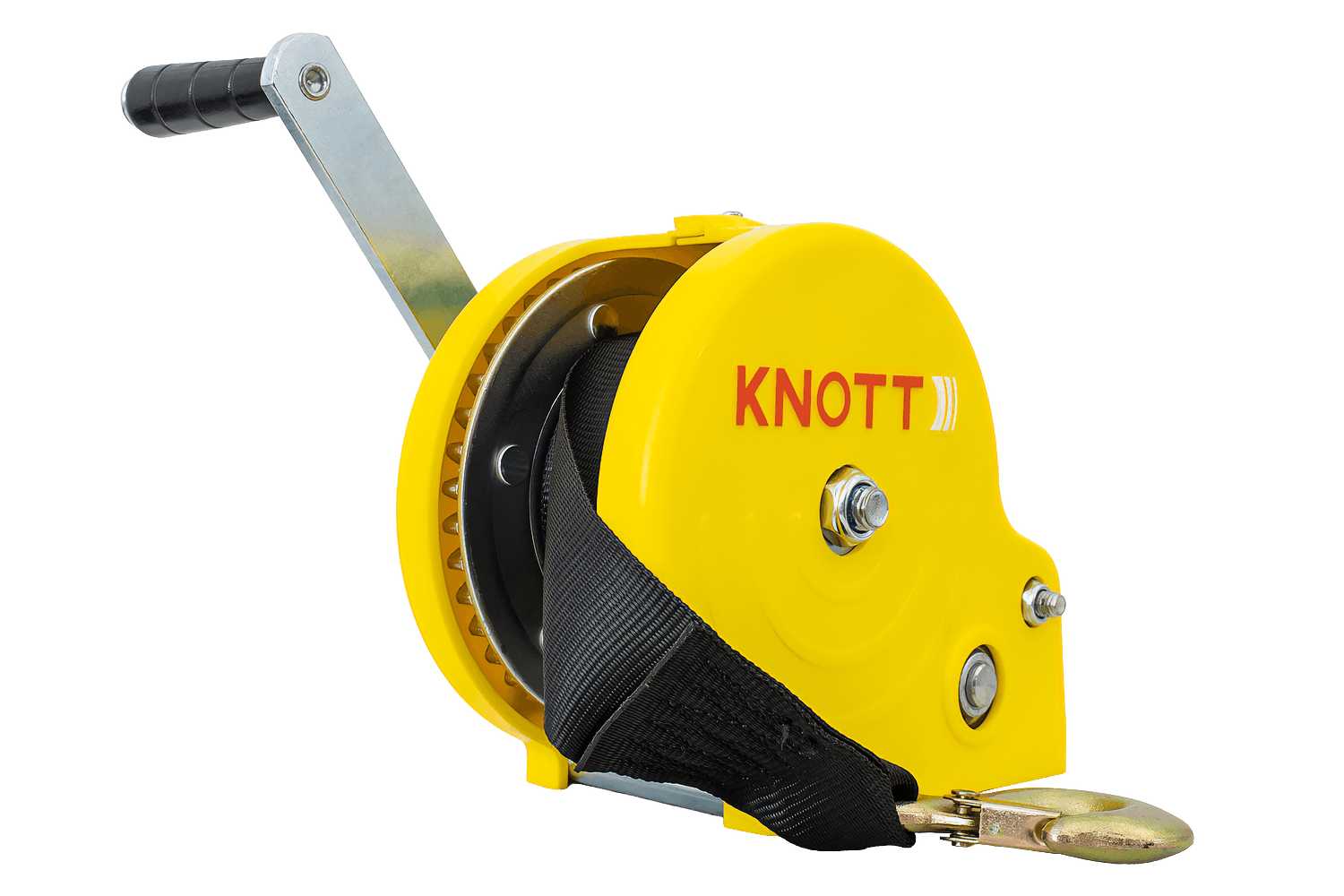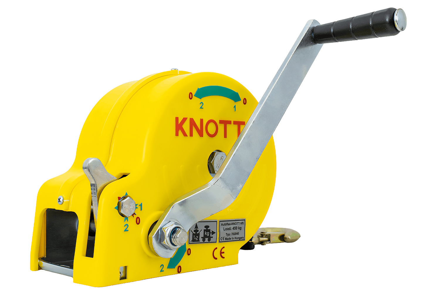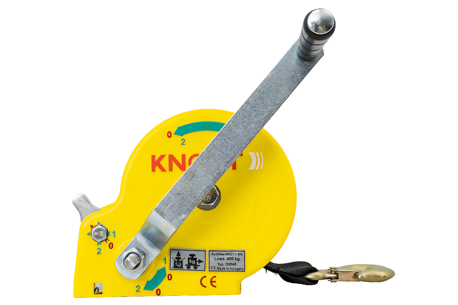 Handlier KNOTT met het horizontale maximumtrekvermogen 450 kg. Het model is prima geschikt voor bootaanhangwagens. De handlier heeft een kruk die gemonteerd is met één schroef en een 7 m lang band beëindigd met een massieve duurzame haak.