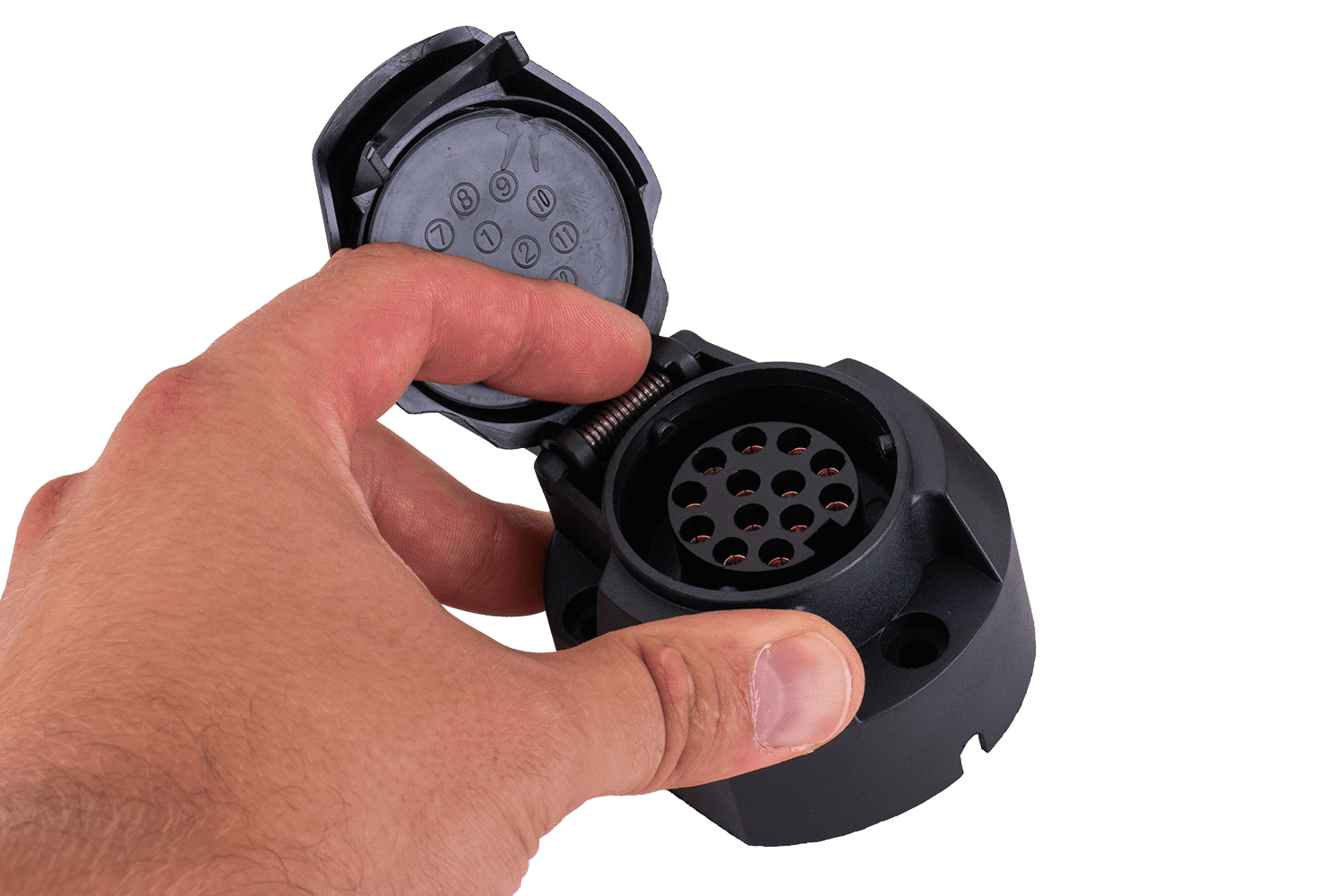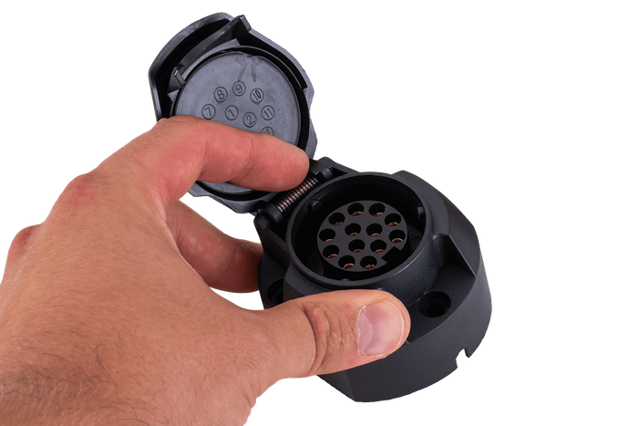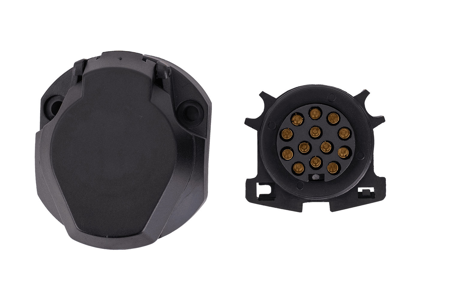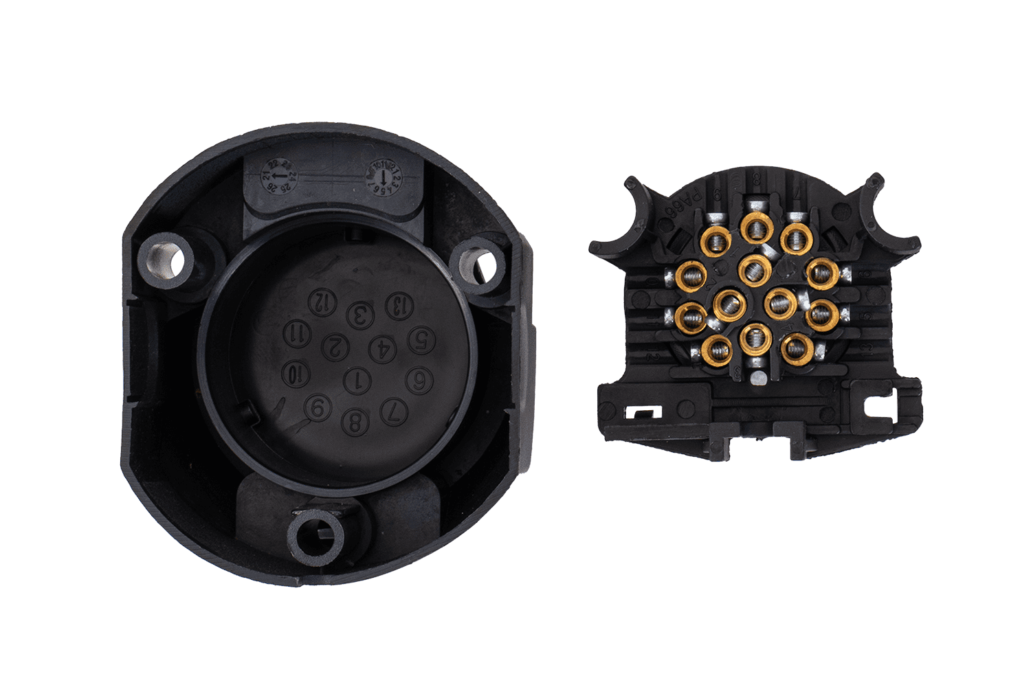 - Deze 13-polige 12V-aansluiting, ontworpen voor montage op de trekhaak van een voertuig, wordt gebruikt om een caravan of andere aanhanger met een gewicht van meer dan 750 kilogram aan te sluiten. Het zorgt voor een betrouwbare elektrische verbinding tus