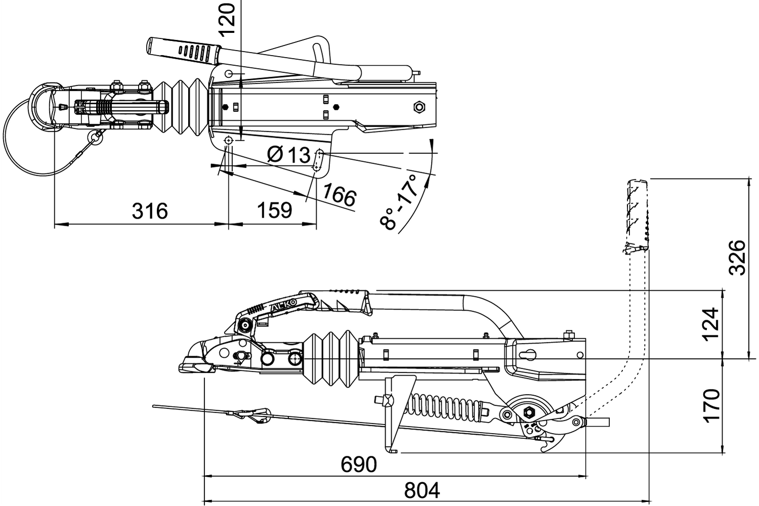 De oploopinrichting biedt twee montagemogelijkheden: bovenaan of onderaan de dissel , wat flexibiliteit biedt voor aanpassing aan verschillende aanhangerontwerpen. Houd er echter rekening mee dat bij montage onderop de maximaal toegestane hoogte van de dissel 100 mm bedraagt. Deze montageveelzijdigheid maakt optimalisatie van de gewichtsverdeling, aanpassing aan verschillende trailerconstructies en aanpassing aan specifieke toepassingsvereisten mogelijk, waardoor de veiligheid en efficiëntie van het apparaat in een verscheidenheid aan toepassingen wordt gegarandeerd.
