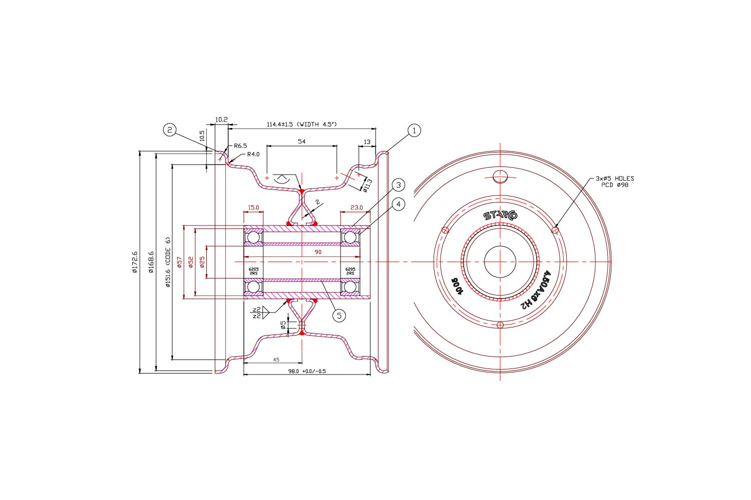 STARCO stalen velg 4.50A×6" H2 3x98 met 6205-2RS lagers
