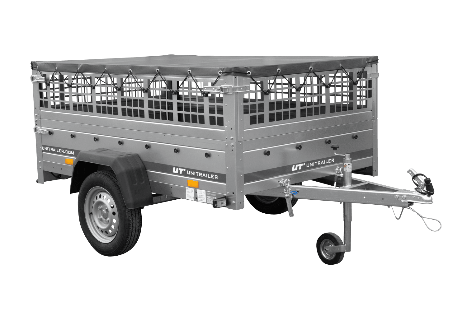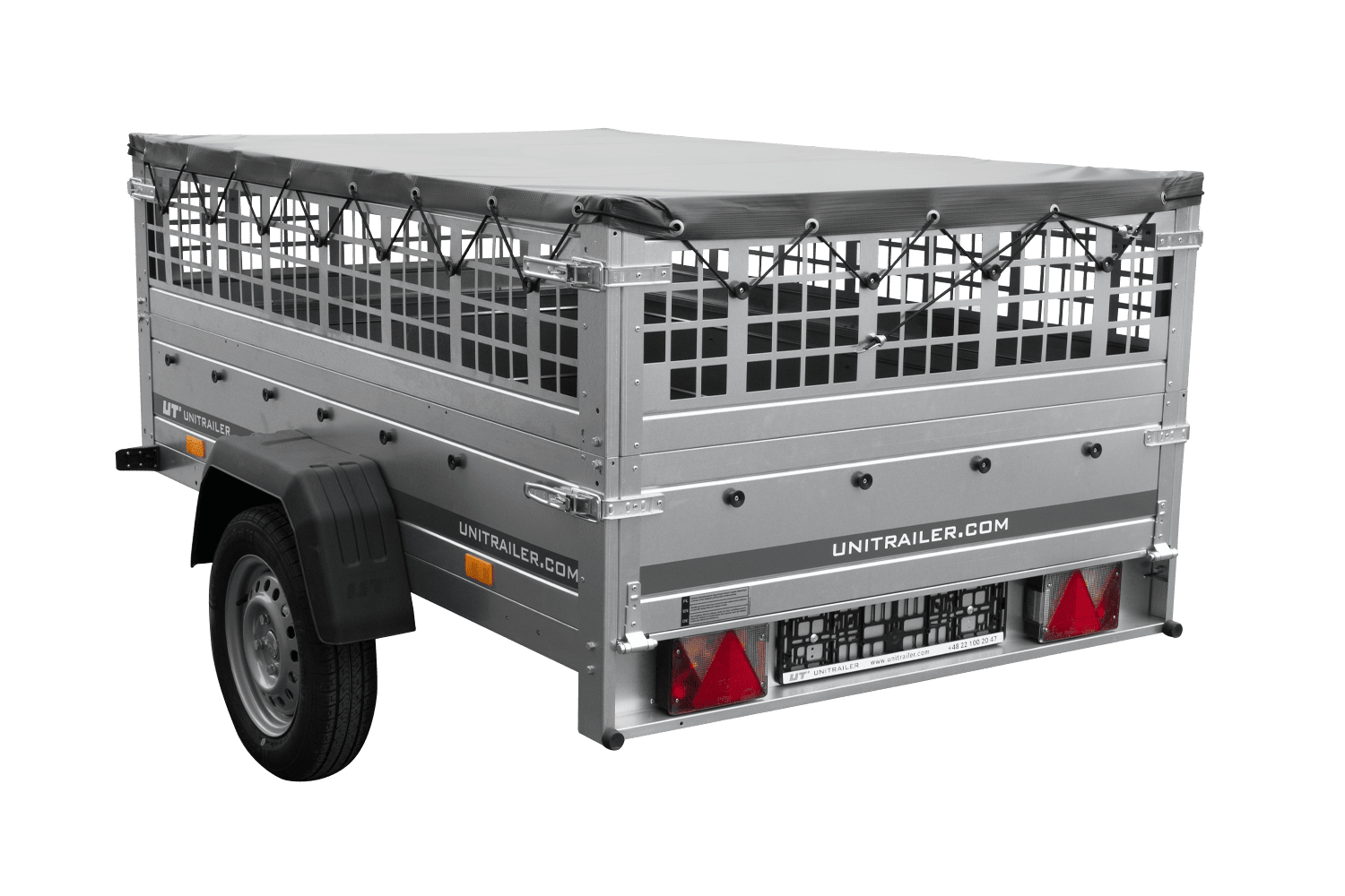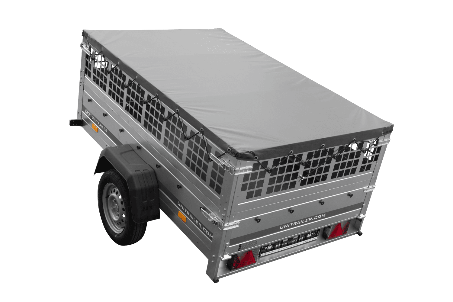 Enkelassige aanhanger 200x125 UNITRAILER GARDEN 201 KIPP met gaaswanden en grijze afdekking