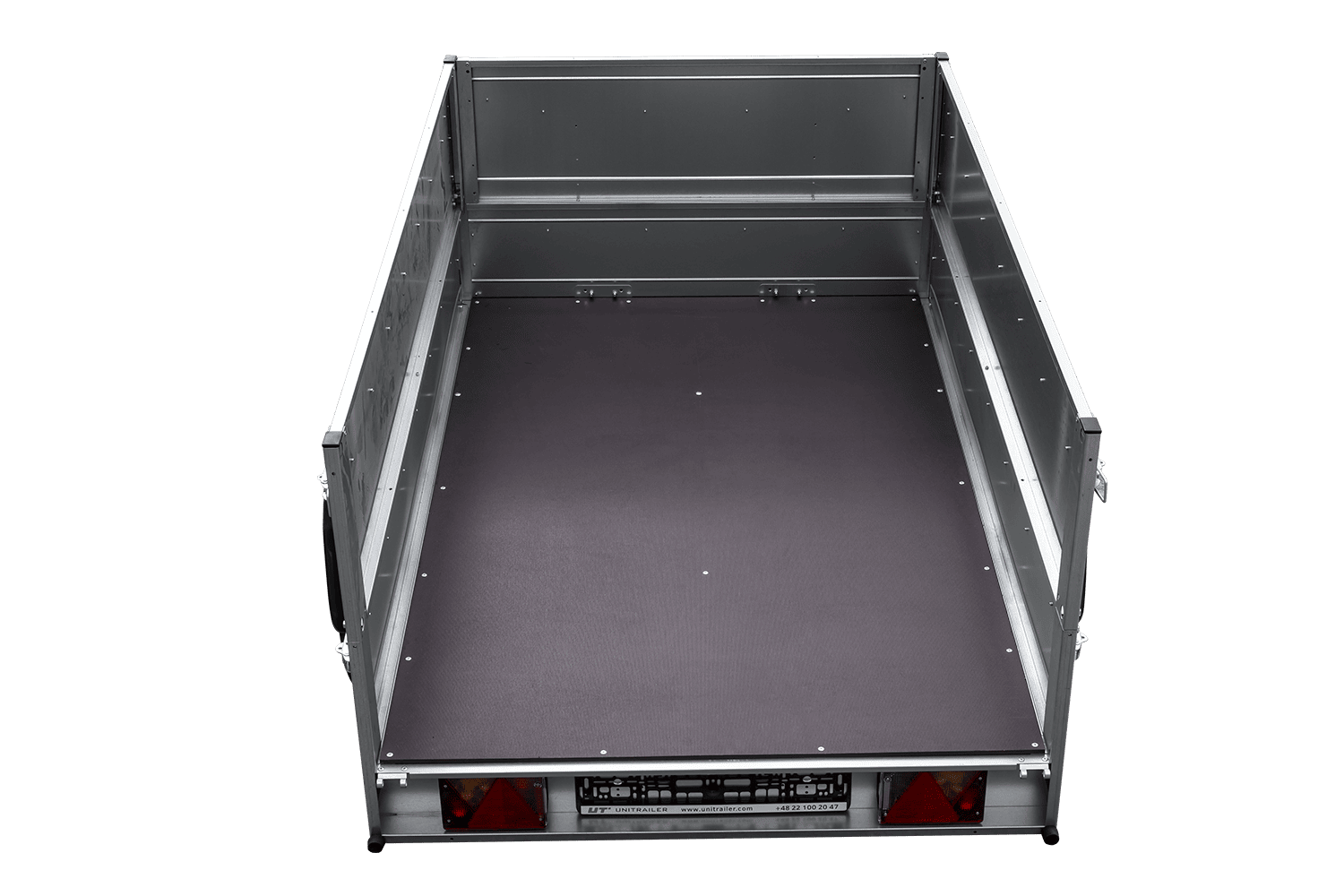 - CARROSSERIE - vloer gemaakt van hoogwaardig, waterdicht, antislip multiplex, 9 mm dik, met transportoppervlakteafmetingen: 2006 mm lang x 1256 mm breed. Totale afmetingen van de trailer: 2906 mm lang x 1685 mm breed x 777 mm hoog