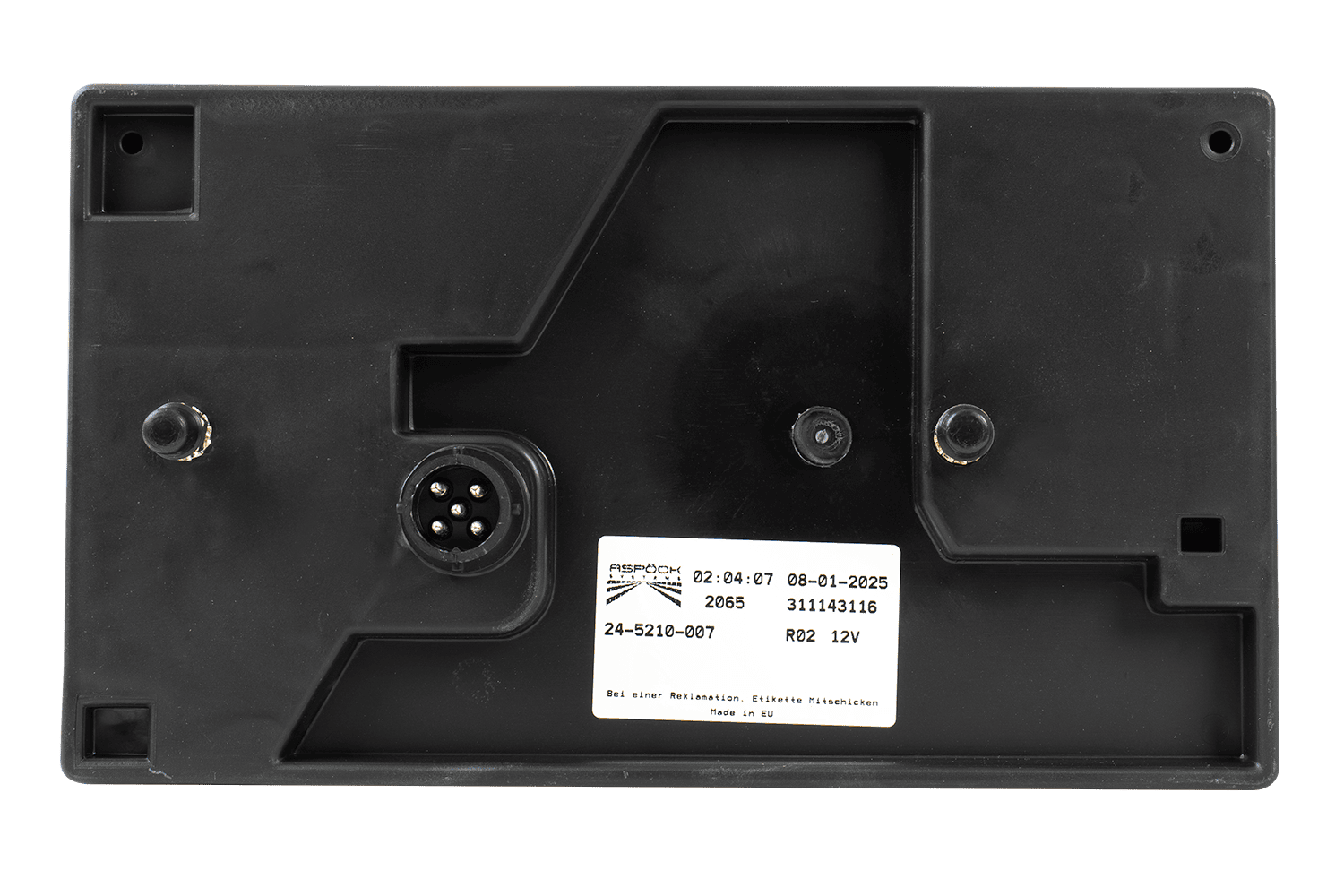 Het Multipoint I achterlicht van ASPÖCK is bedoeld voor montage aan de rechterkant van het voertuig en heeft de volgende afmetingen: breedte 240 mm, hoogte 140 mm, diepte 52 mm . Uitgerust met een 5-polige bajonetaansluiting , waardoor een eenvoudige en snelle installatie mogelijk is in aanhangwagens, bussen en takelwagens .