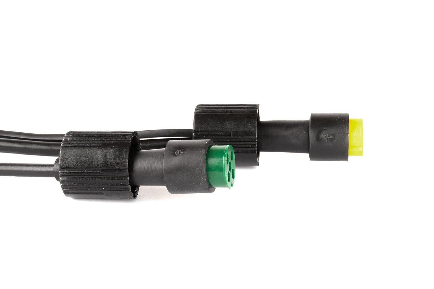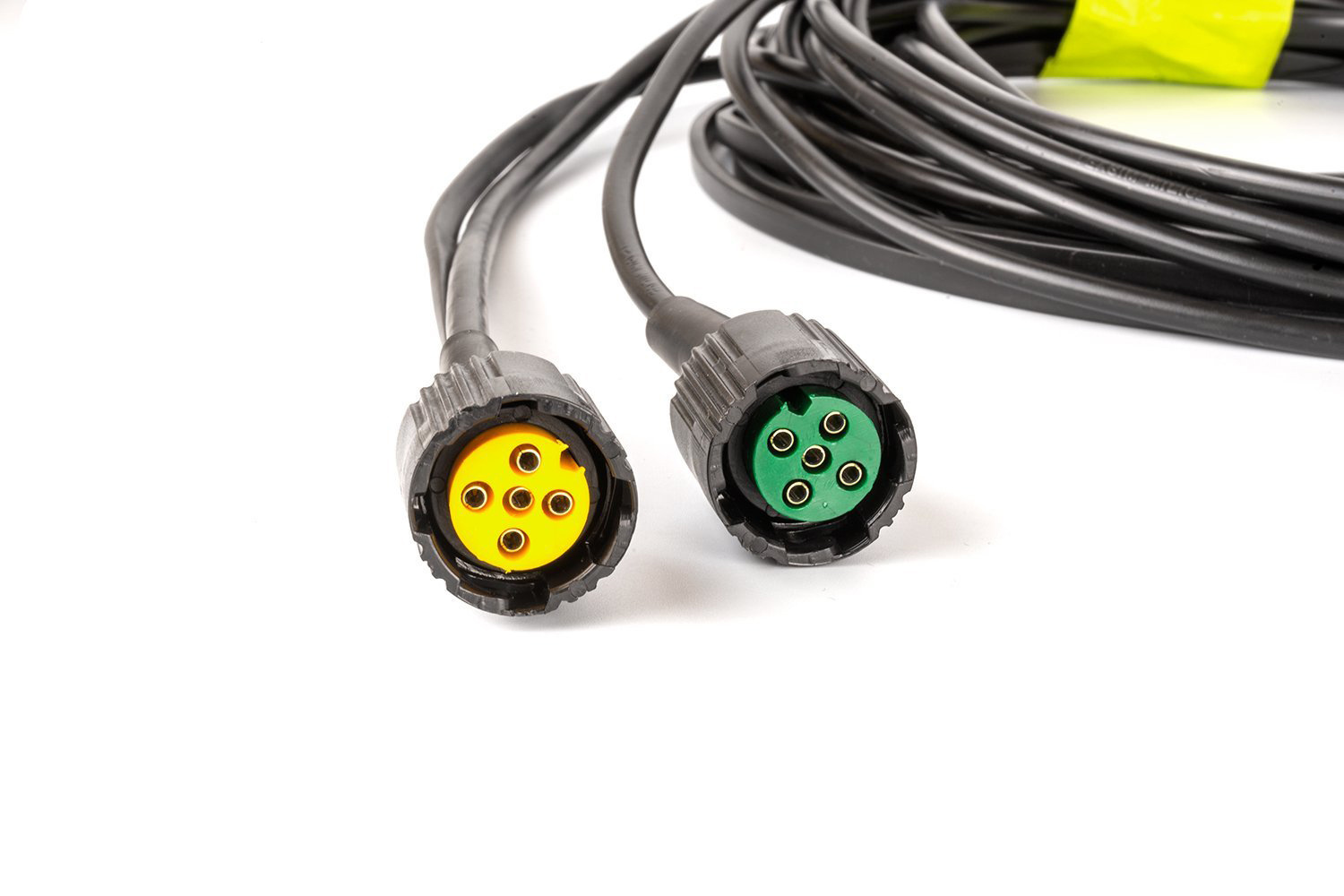 De kabelboom is uitgerust met twee 5-polige bajonetconnectoren voor het aansluiten van de achterlichten. Het bajonetsysteem zorgt voor een snelle en veilige installatie, waardoor het risico op onbedoelde loskoppeling tijdens het rijden wordt geëlimineerd. Het connectorontwerp garandeert een waterdichte verbinding en beschermt de contacten tegen corrosie, waardoor een langdurige, probleemloze werking van het gehele verlichtingssysteem van de aanhanger wordt gegarandeerd.