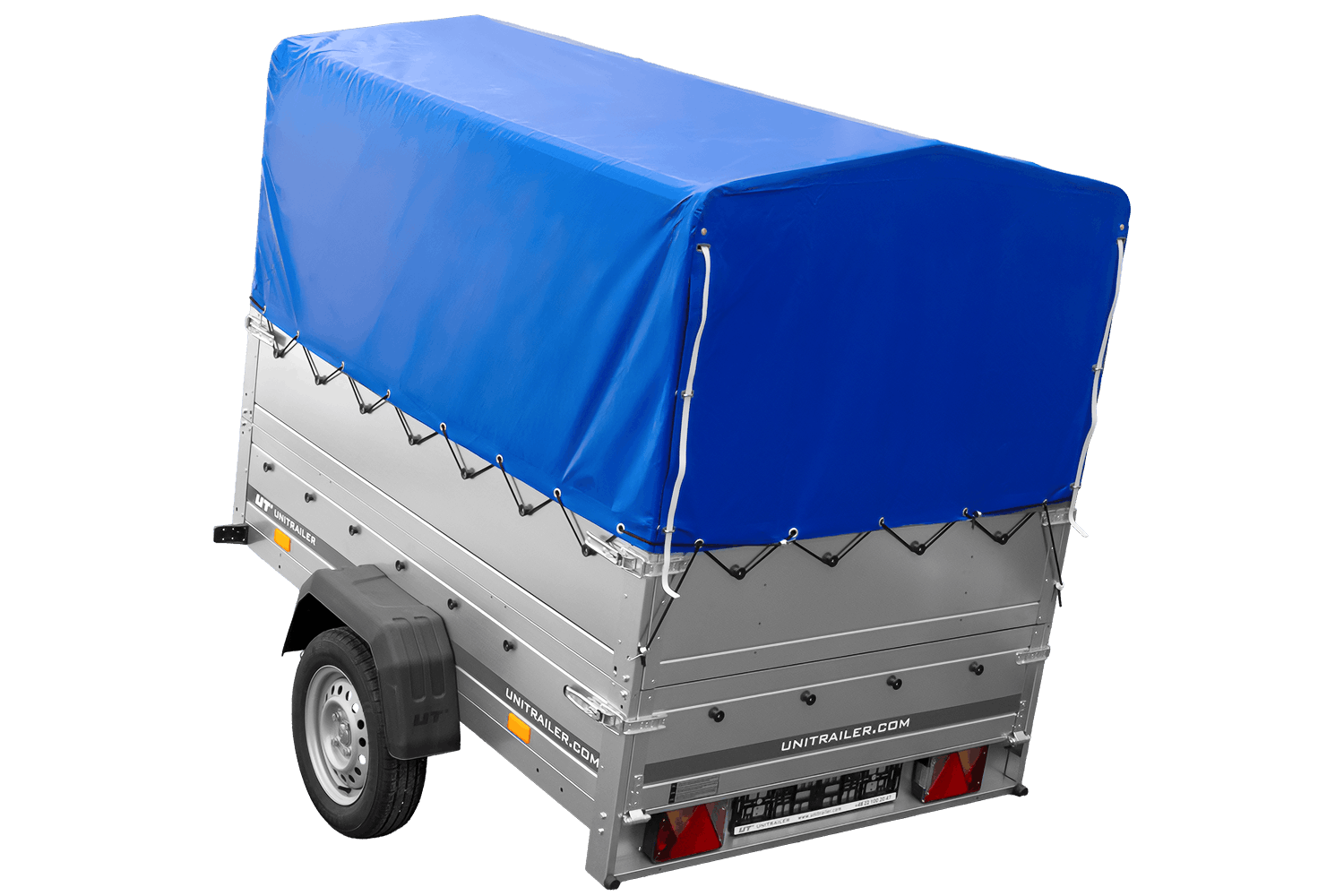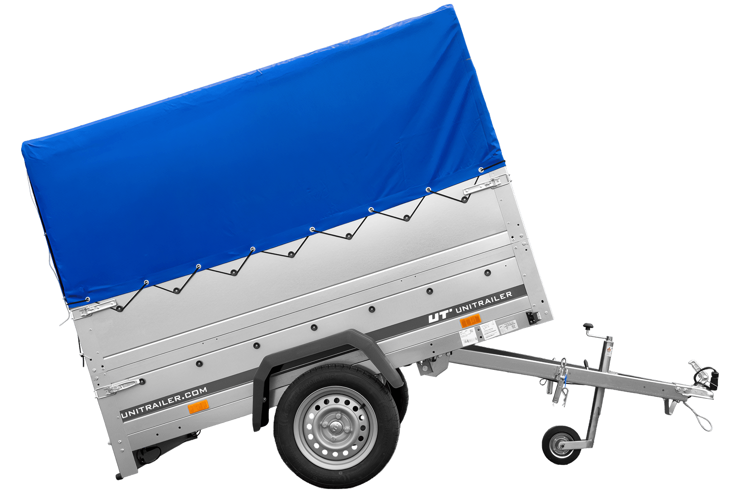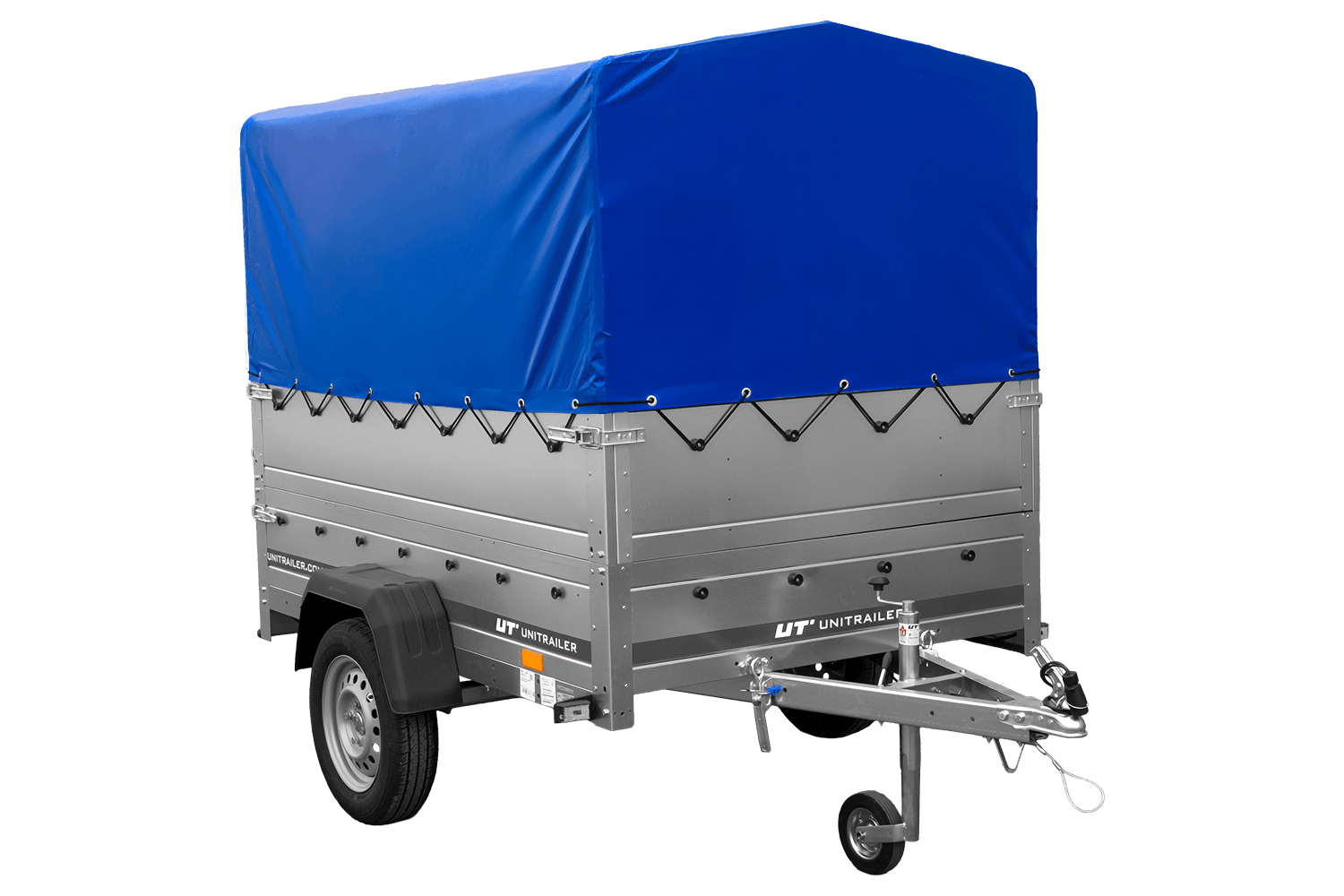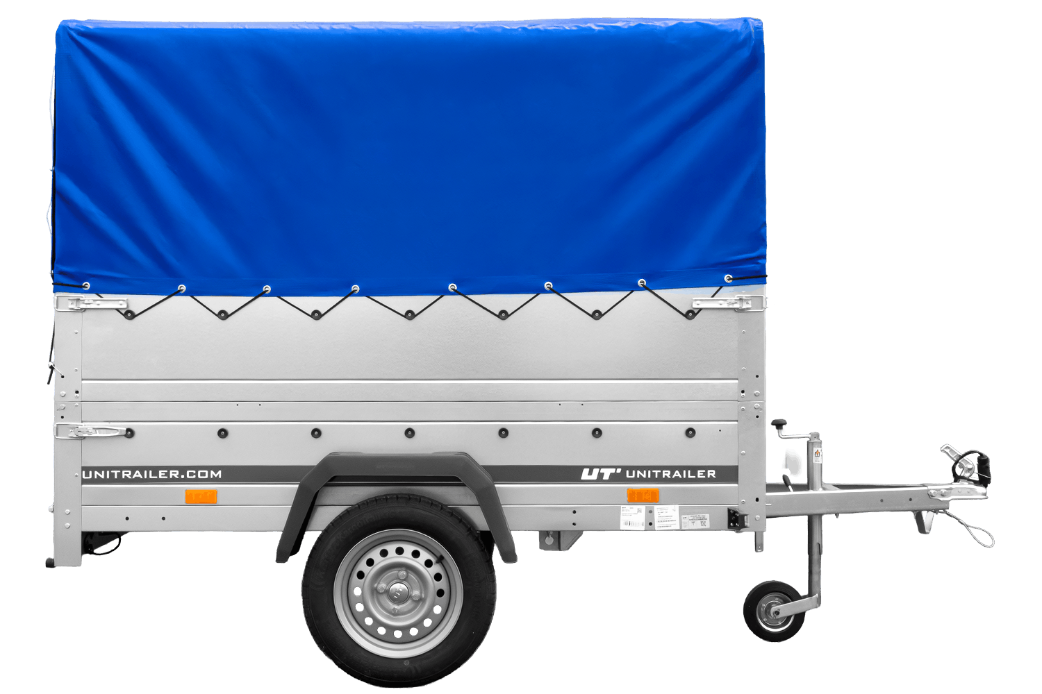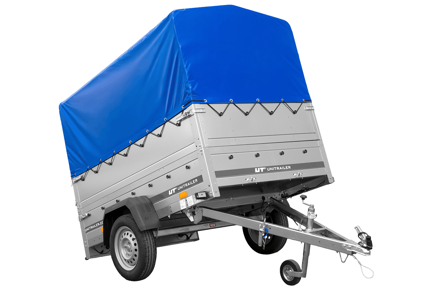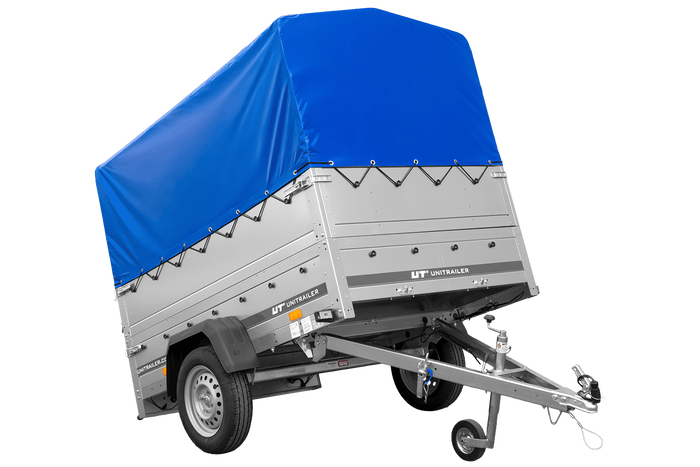 Enkelassige aanhanger 200x125 UNITRAILER GARDEN 201 KIPP met BIS-zijwanden, H-800 frame en blauwe afdekking