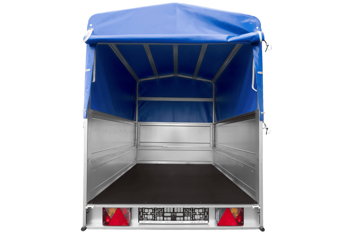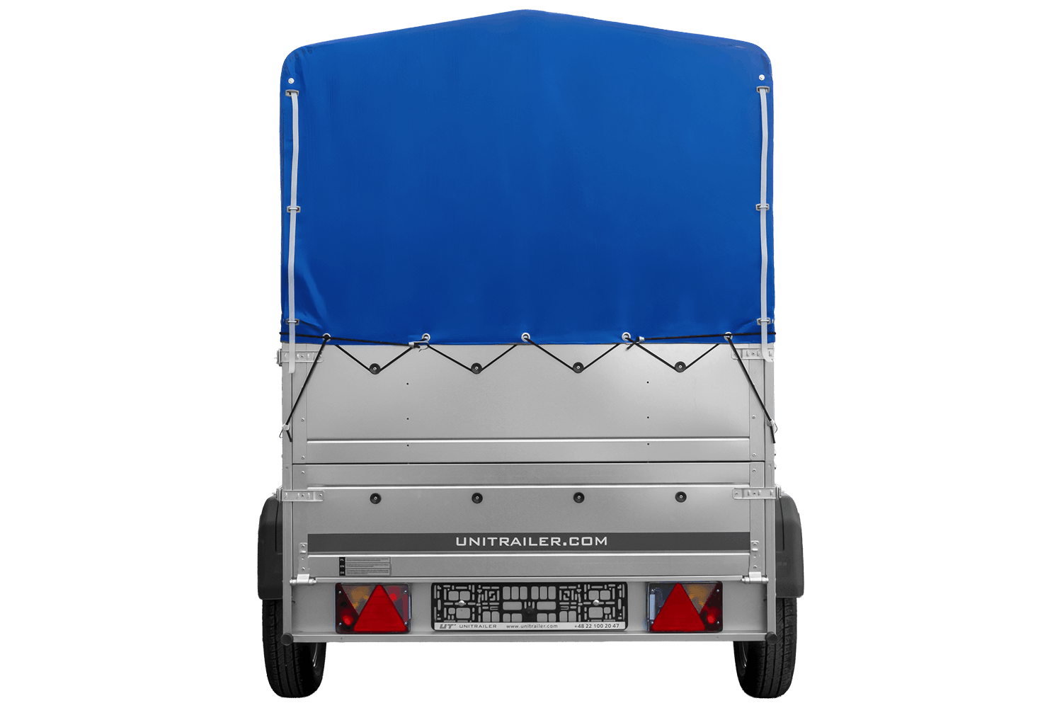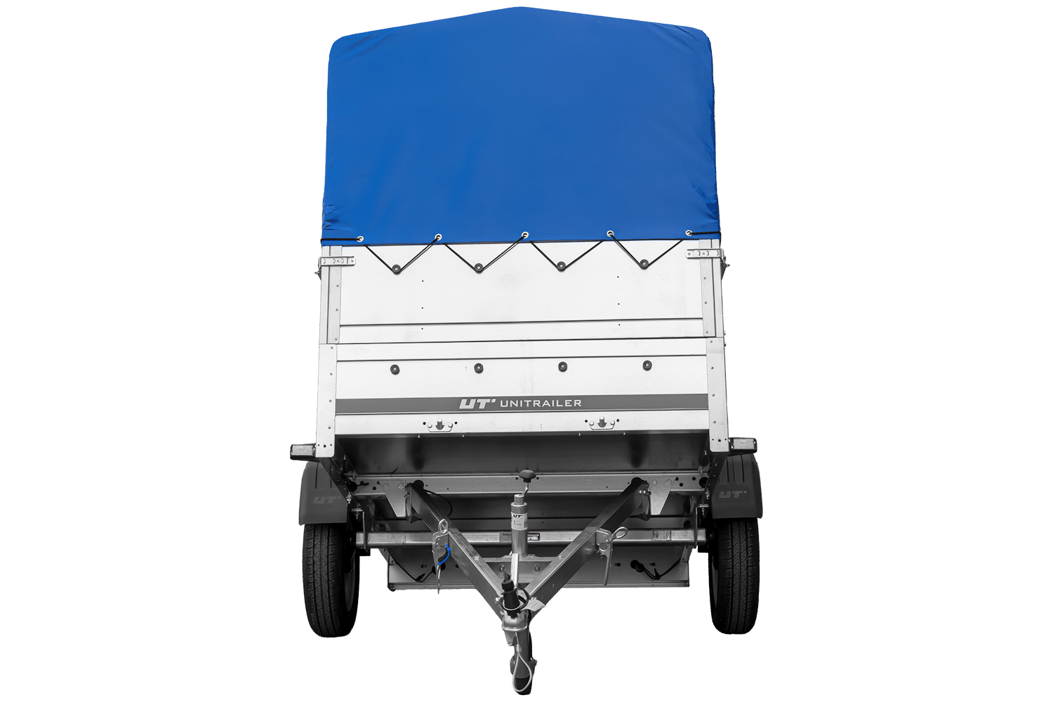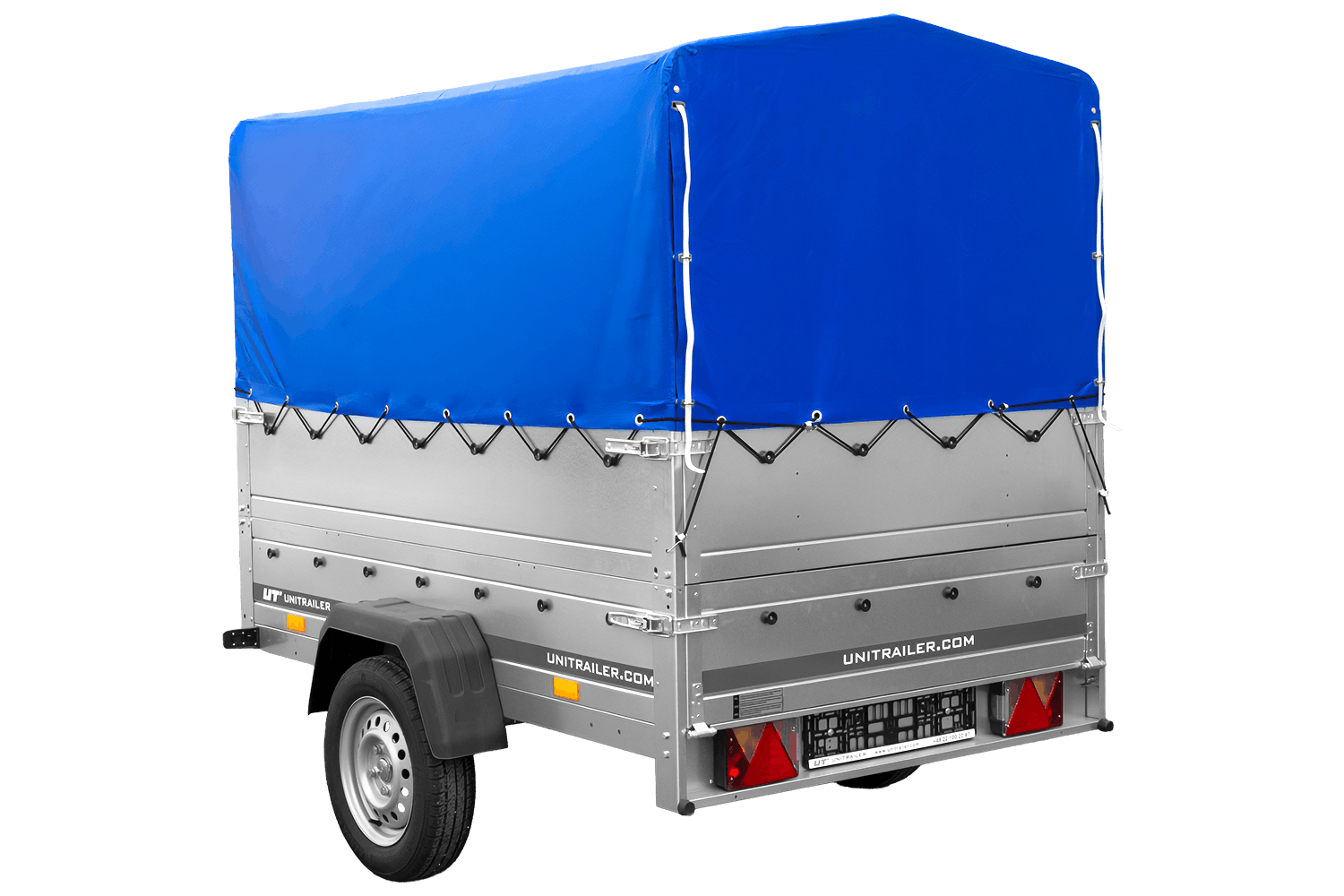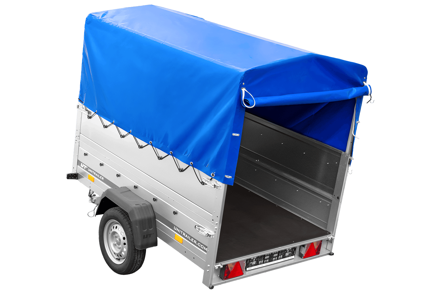 Enkelassige aanhanger 200x125 UNITRAILER GARDEN 201 KIPP met BIS-zijwanden, H-800 frame en blauwe afdekking