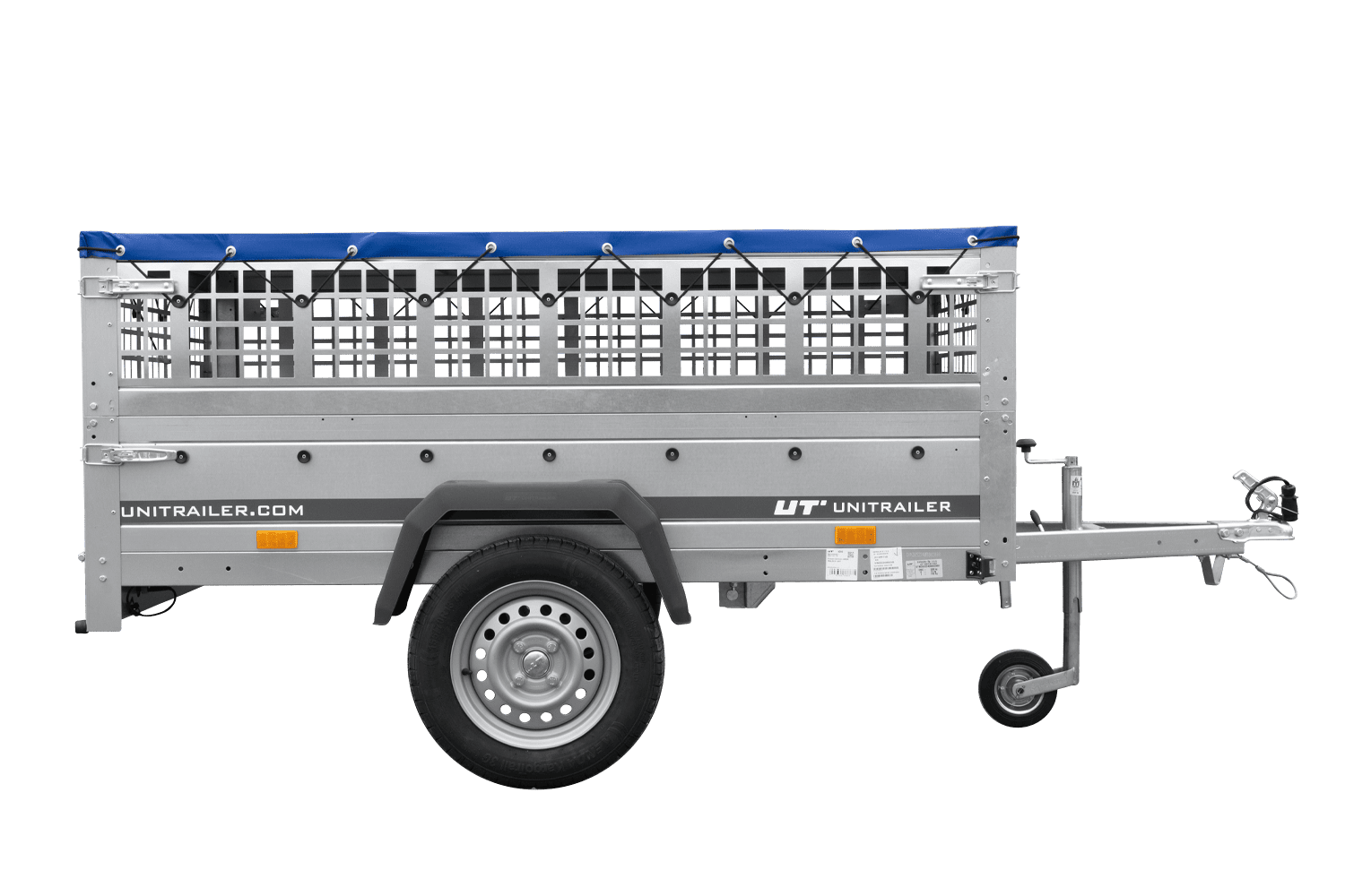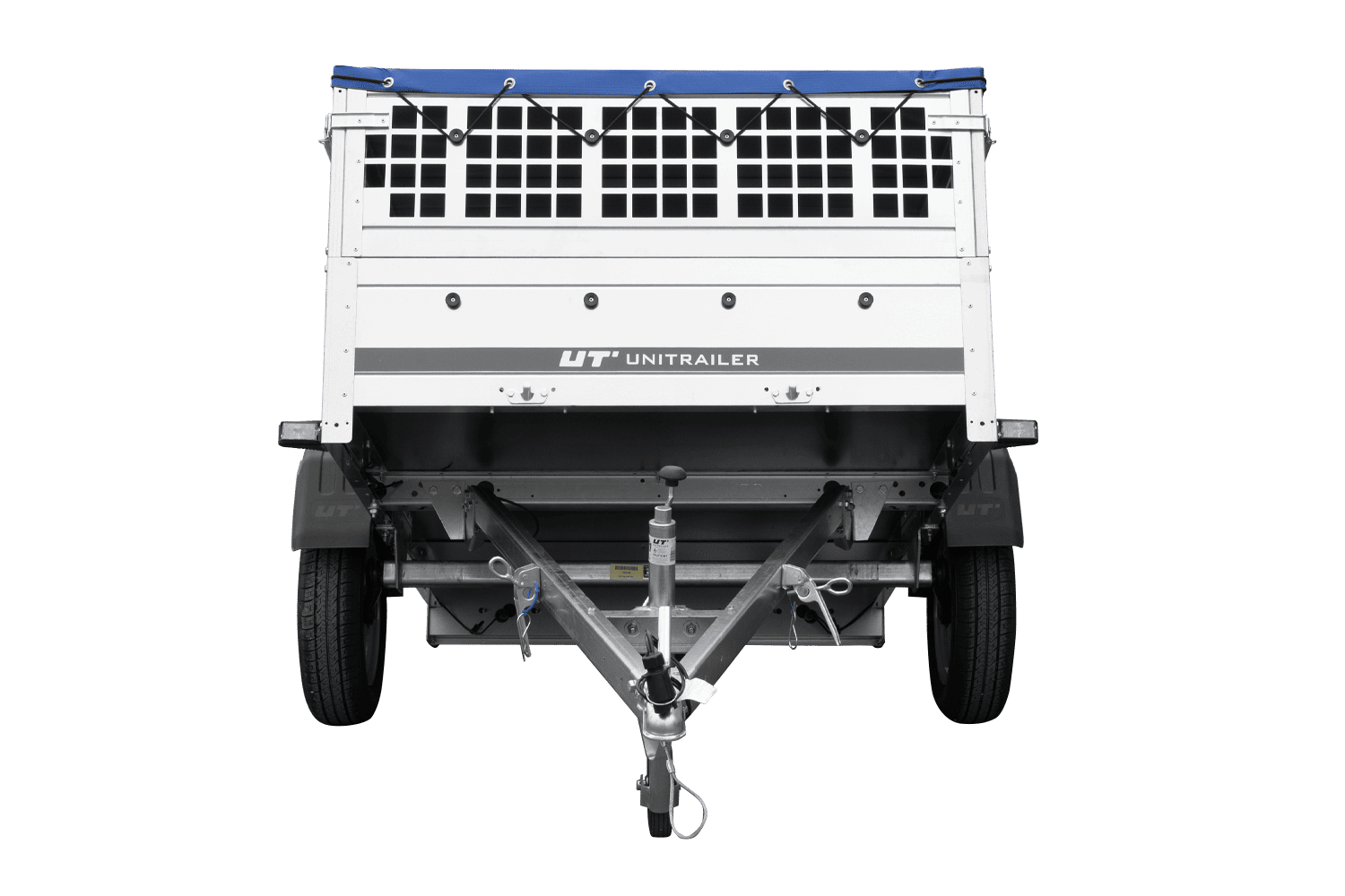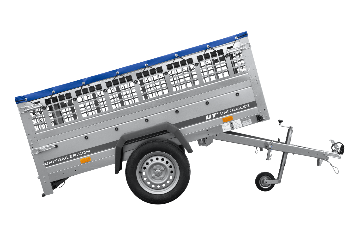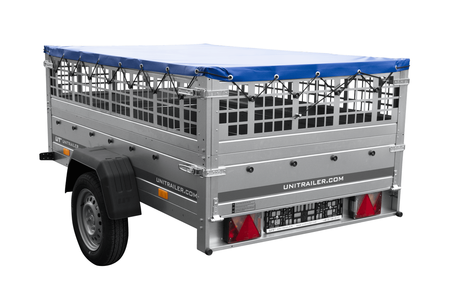 Enkelassige aanhanger 200x125 UNITRAILER GARDEN 201 KIPP met gaaswanden, H-0 frame en blauw dekzeil