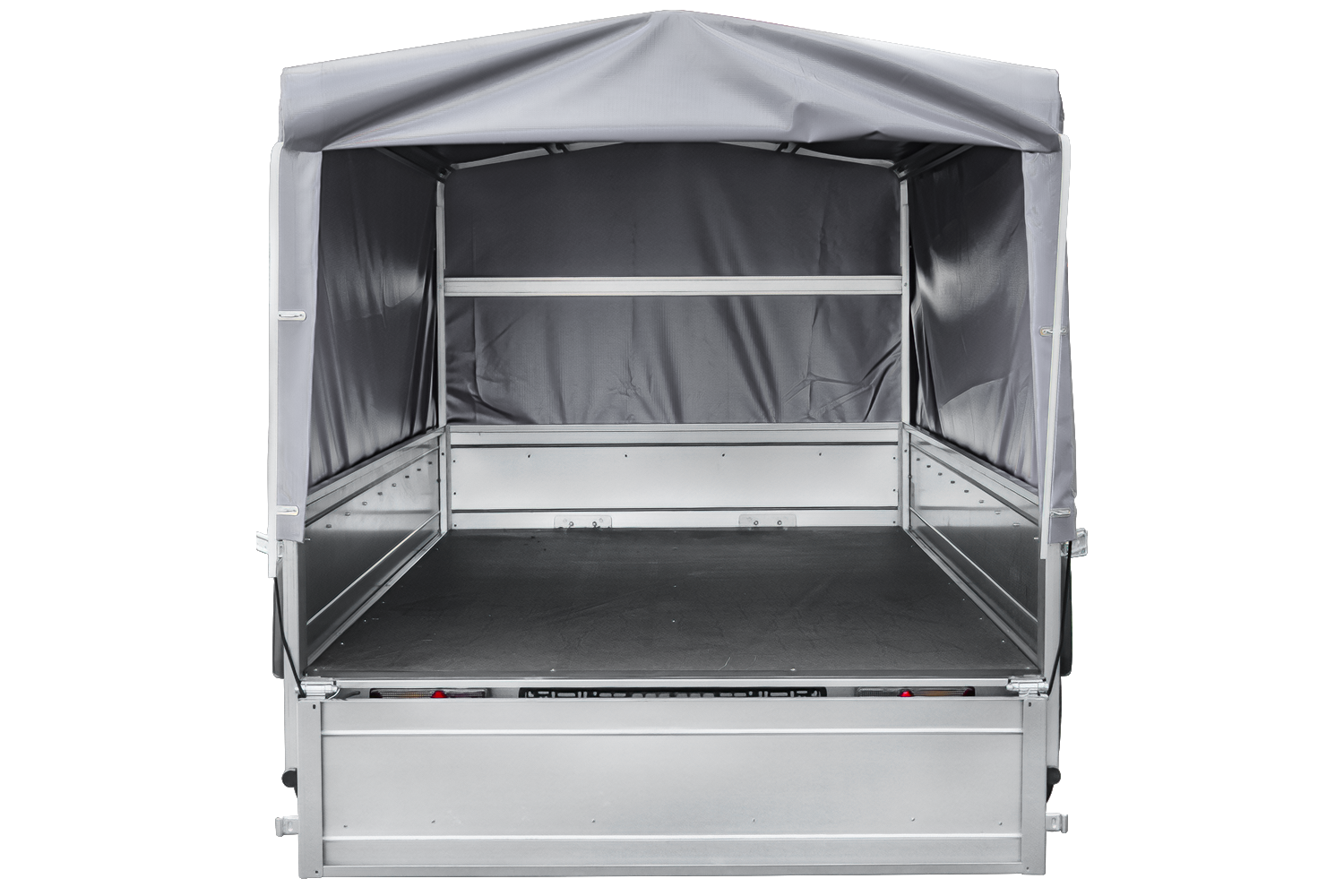 - De GARDEN TRAILER 264 aanhangwagen met frame en grijs dekzeil is een enkelassige aanhangwagen met een maximaal GVW van 750 kg. Om het laden en lossen te vergemakkelijken beschikt de trailer over de mogelijkheid om de achterzijde te openen of te verwijdere