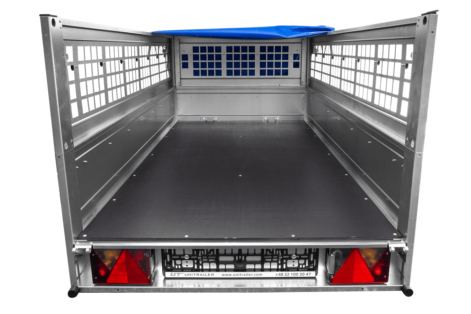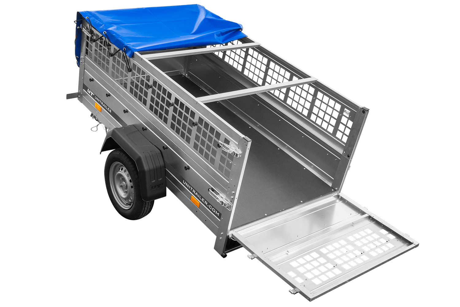 Enkelassige aanhanger Unitrailer GARDEN TRAILER 200 KIPP in een set met een steunwiel, gaaswanden, H-0 plat frame en een blauwe hoes