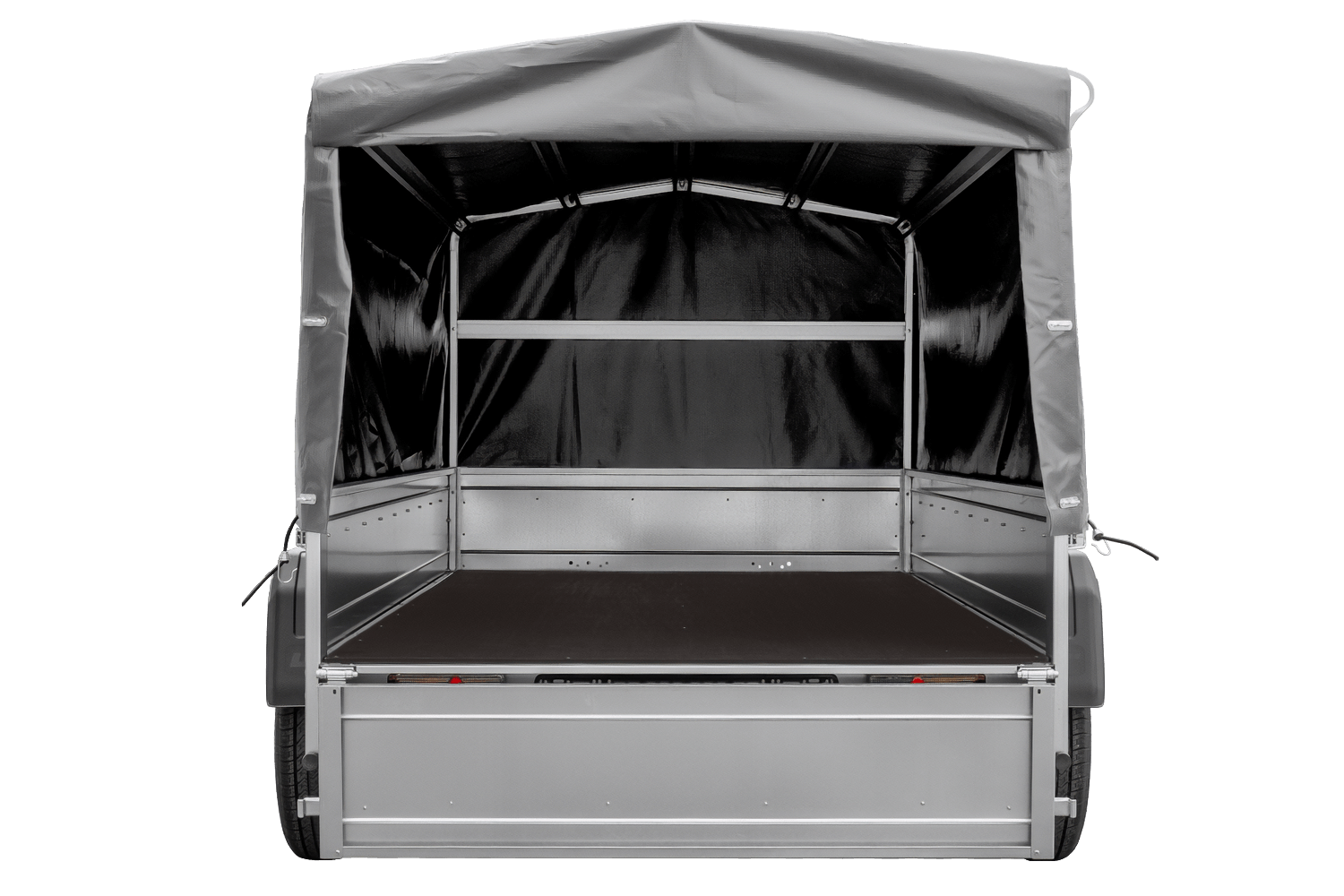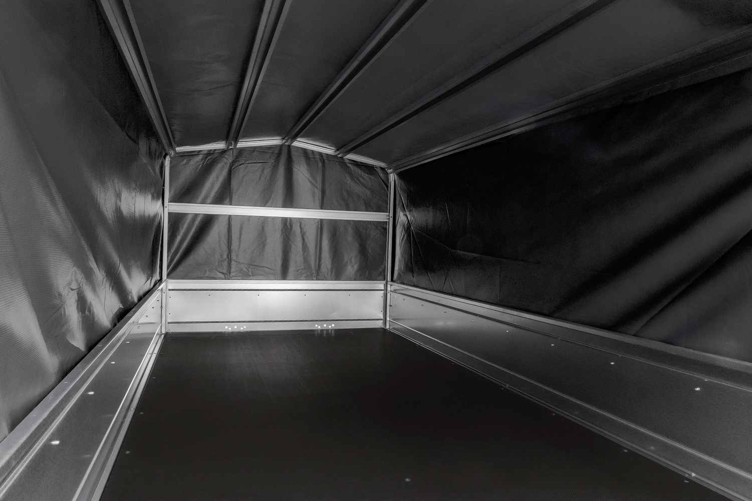 - BODY – vloer gemaakt van hoogwaardig, waterdicht, antislip multiplex. 9 mm met afmetingen transportoppervlak: 2640 mm lang x 1250 mm breed. Totale afmetingen van de aanhangwagen: 3541 mm lang x 1690 mm breed x 1120 mm hoog (met frame en dekzeil).