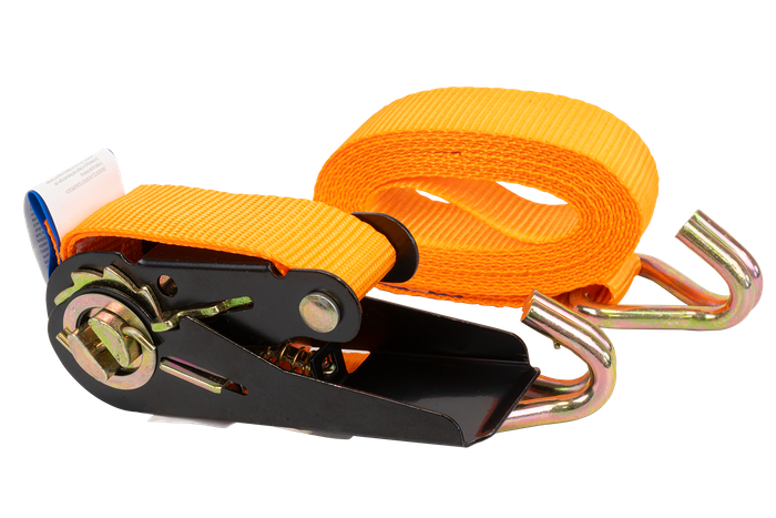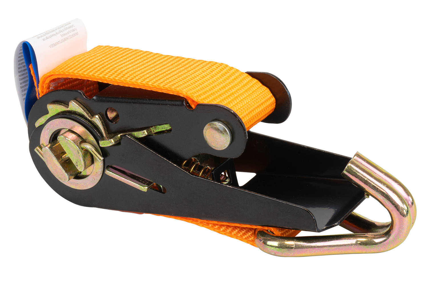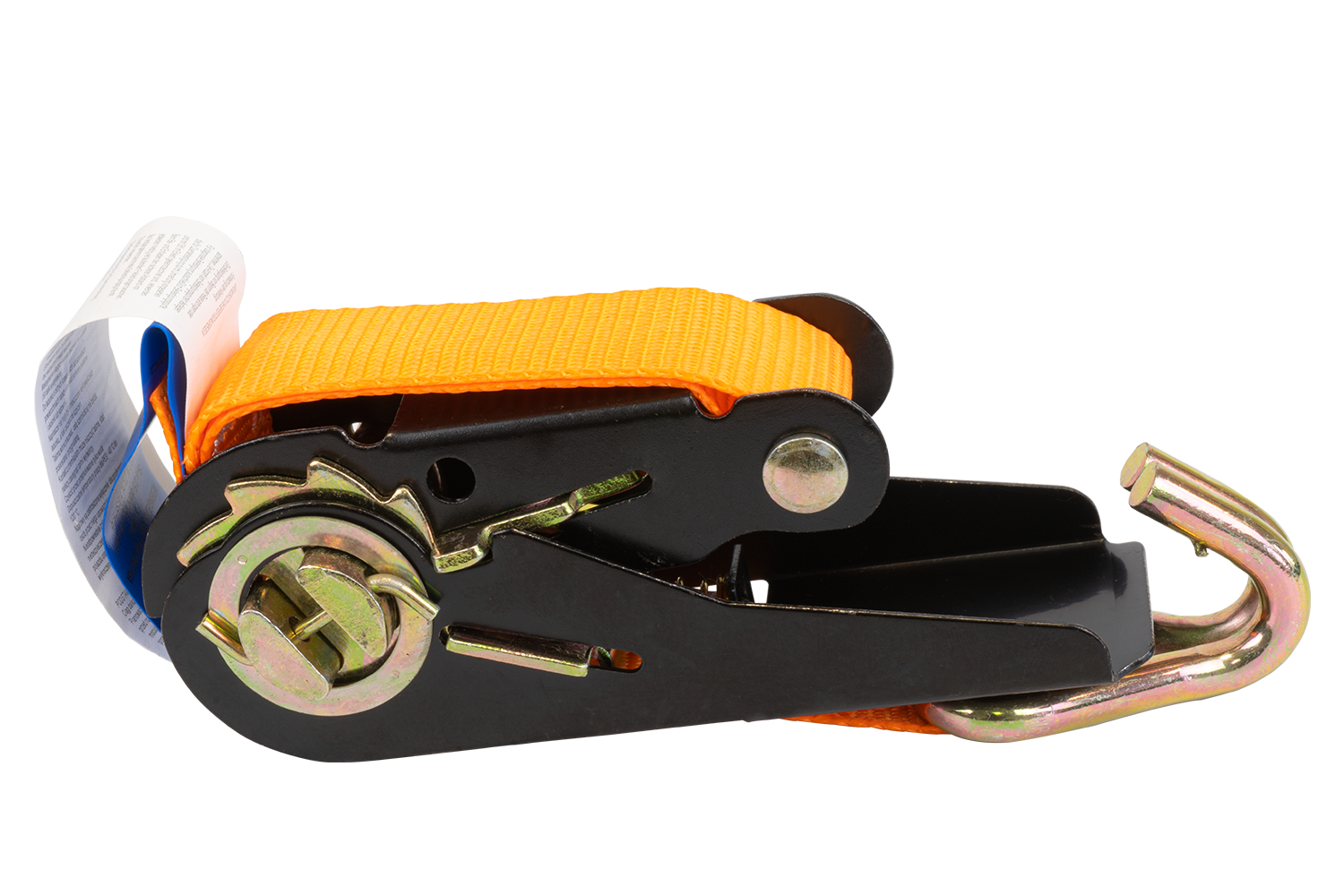 De oranje KAMAR spanband met ratel bestaat uit twee delen: een korter deel met ratel en haak, en een langer deel met band en haak. De totale lengte van de band, inclusief band en gesp, is 3 meter, wat voldoende lengte biedt voor diverse transporttoepassingen. De 25 mm brede band zorgt voor een optimaal klemoppervlak. De band heeft een treksterkte van 0,8 ton (800 daN), waardoor hij ideaal is voor het veilig vastzetten van kleine ladingen zoals tuingereedschap, lichtgewicht bouwmaterialen of werkplaatsapparatuur tijdens transport.