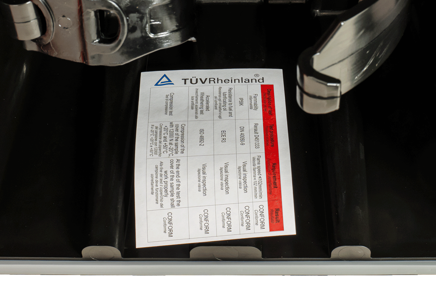 De brandblusserbox is VCA-goedgekeurd als zijbeveiligingssysteem , E11 73 R - 011168 certificaat en laboratoriumtests TÜV Rheinland . VCA-goedkeuring bevestigt dat het product geschikt is als beschermingselement aan de zijkant van het voertuig en voldoet aan strenge veiligheidseisen op het gebied van de bescherming van andere weggebruikers. Deze certificaten bewijzen de hoge kwaliteit van het product en de naleving van internationale veiligheidsnormen in het wegvervoer .