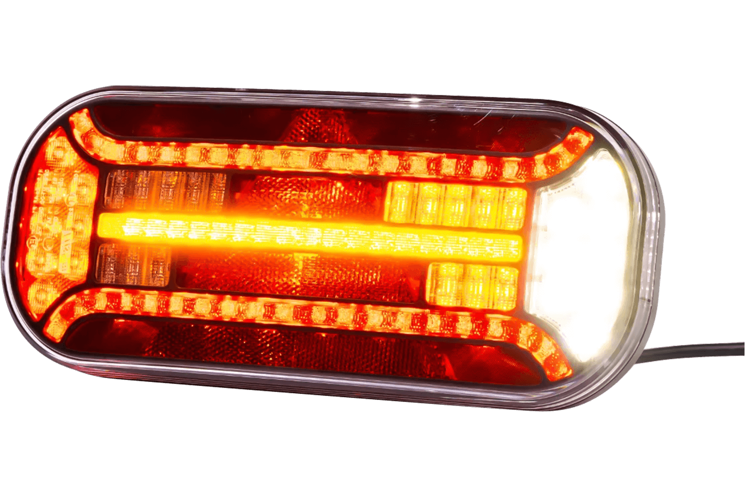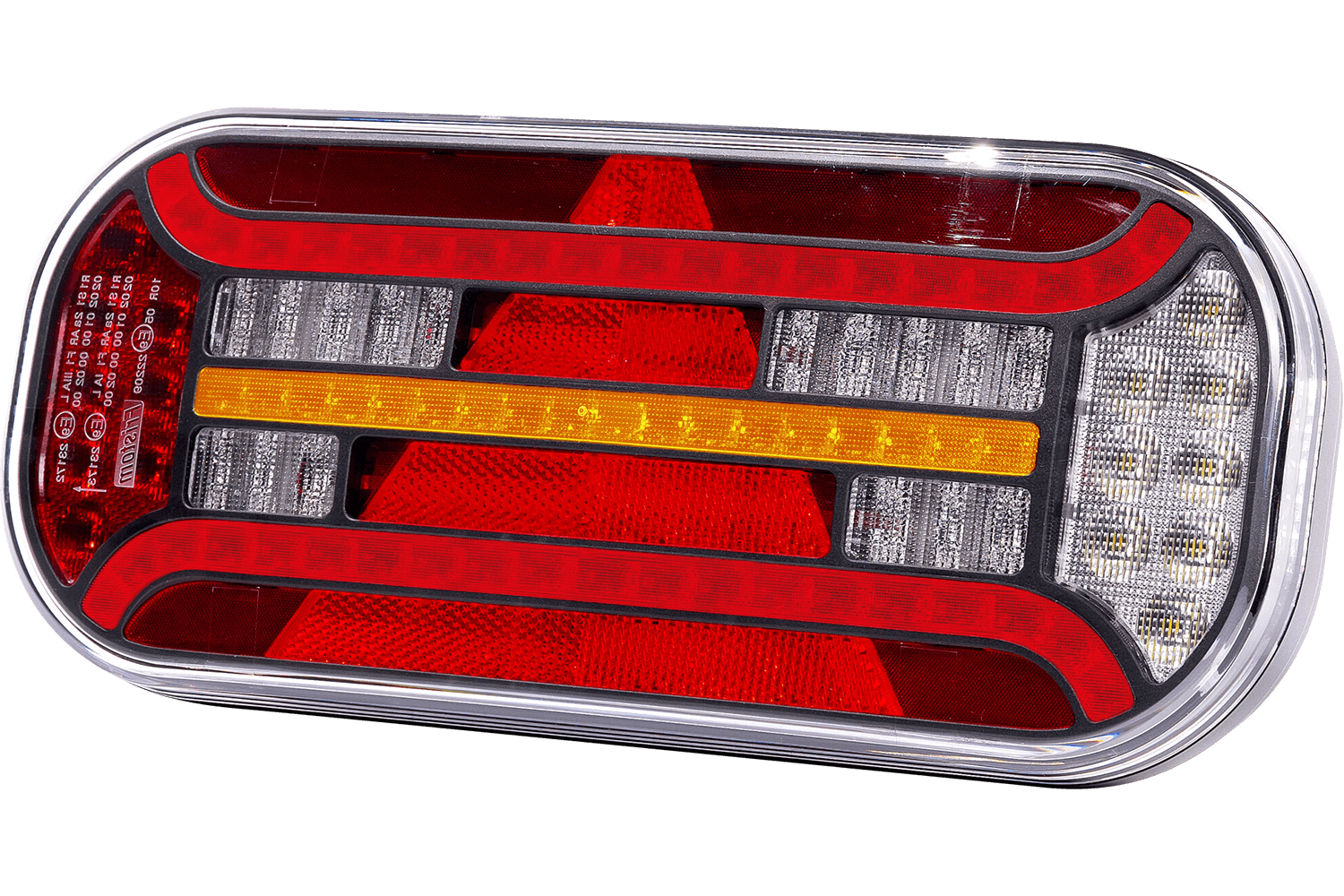 - FT-610 LED achterlicht voor montage aan de linkerkant. Het heeft zes functies: achterlicht, remlicht, achteruitrijlicht, mistlicht, richtingaanwijzer en reflecterende driehoek. Perfect voor gebruik in aanhangwagens en vrachtwagens.