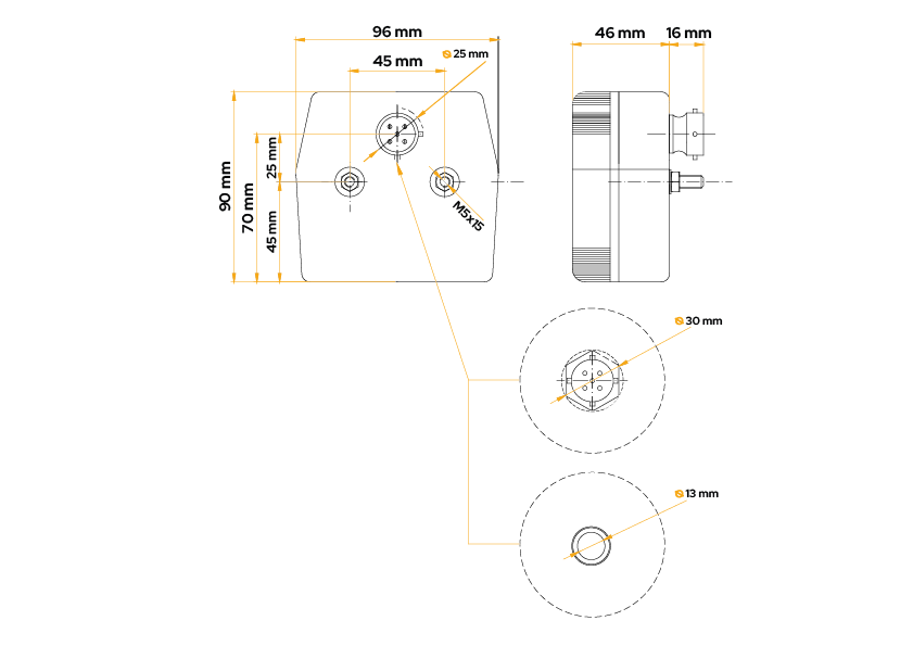 Het achterlicht MD-002 van FRISTOM is ontworpen voor montage aan de linker- en rechterzijde van het voertuig en wordt gekenmerkt door de volgende afmetingen: breedte 96 mm, hoogte 90 mm, diepte 46 mm . Aan de achterkant van de lamp zit een rubberen doorvoertule waarmee u de kabel eenvoudig kunt aansluiten. Hierdoor is de lamp ideaal voor gebruik in aanhangers en bestelwagens .