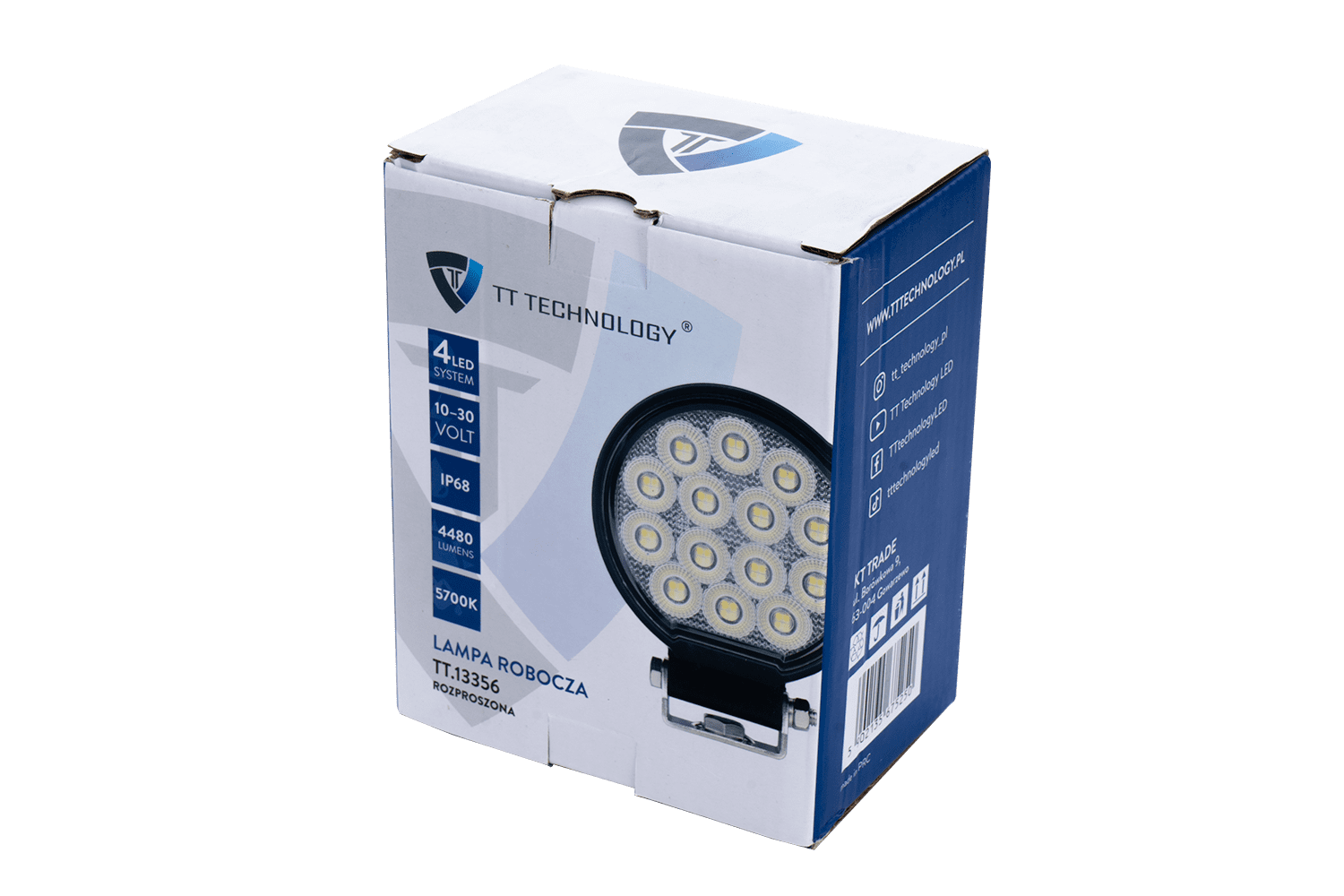 - De ronde werklamp TT.13356 van TT TECHNOLOGY heeft een vermogen van 56 W en genereert 4480 lumen neutraal wit licht (5700 K). Uitgerust met 56 LED's is het ideaal voor landbouwmachines, bouwmachines en bedrijfsvoertuigen.