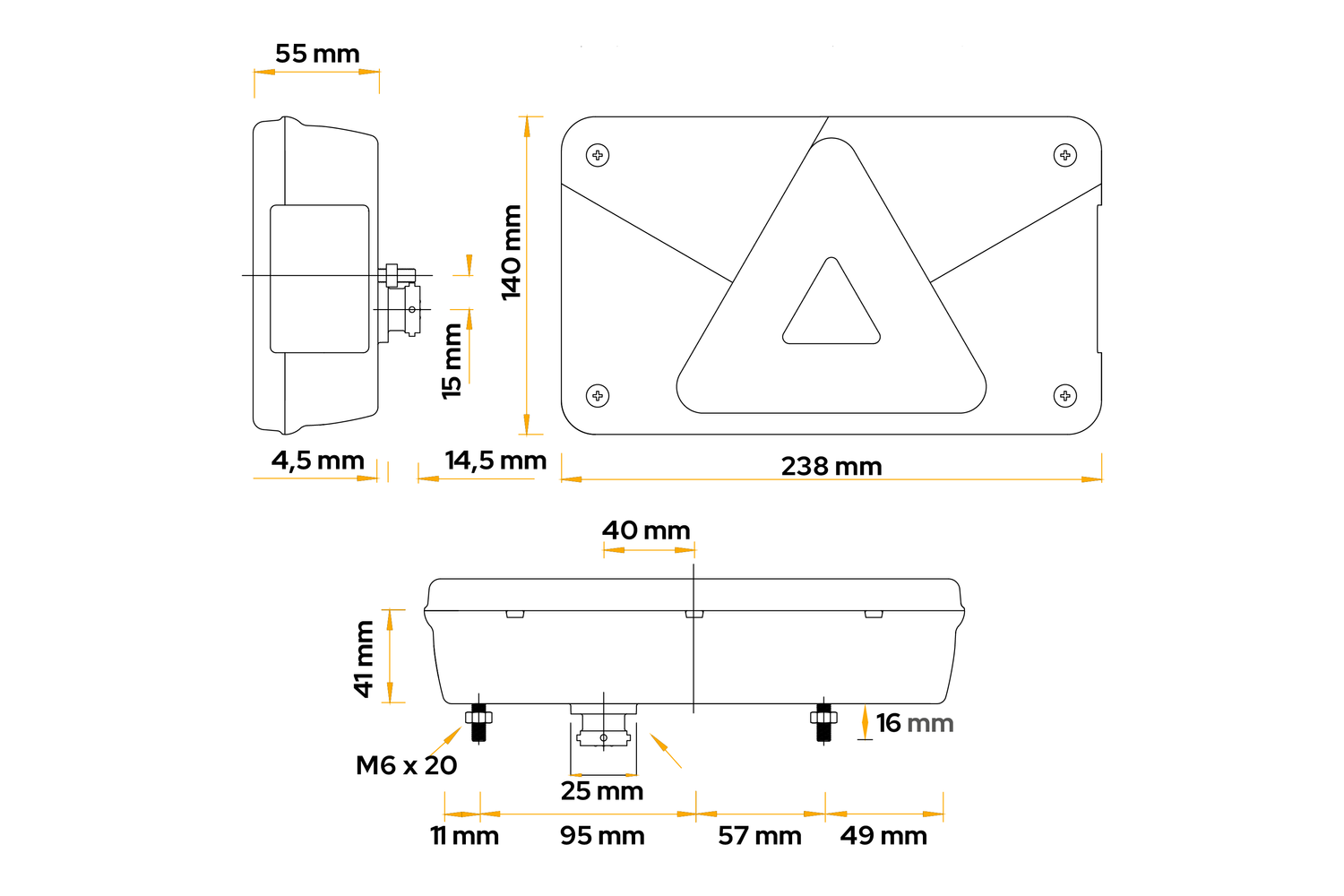 Het Multipoint V achterlicht van ASPÖCK is ontworpen voor montage aan de linkerzijde van het voertuig en heeft de volgende afmetingen: breedte 240 mm, hoogte 140 mm, diepte 52 mm . Uitgerust met een 5-polige bajonetaansluiting , maakt het een eenvoudige en snelle montage mogelijk in aanhangwagens, bussen of takelwagens .