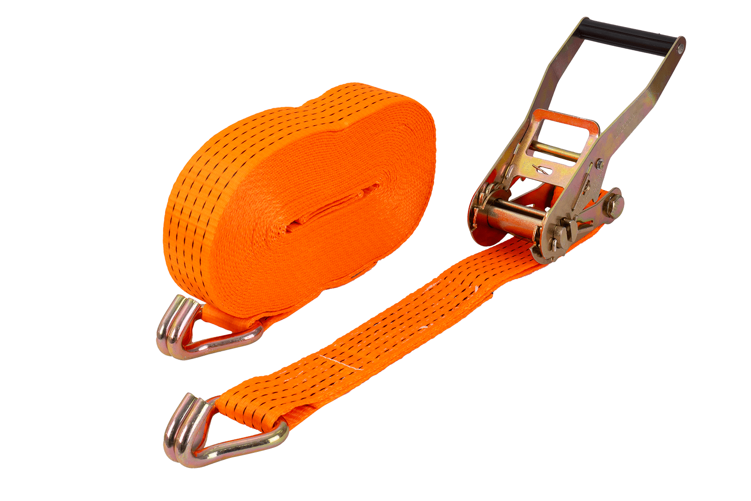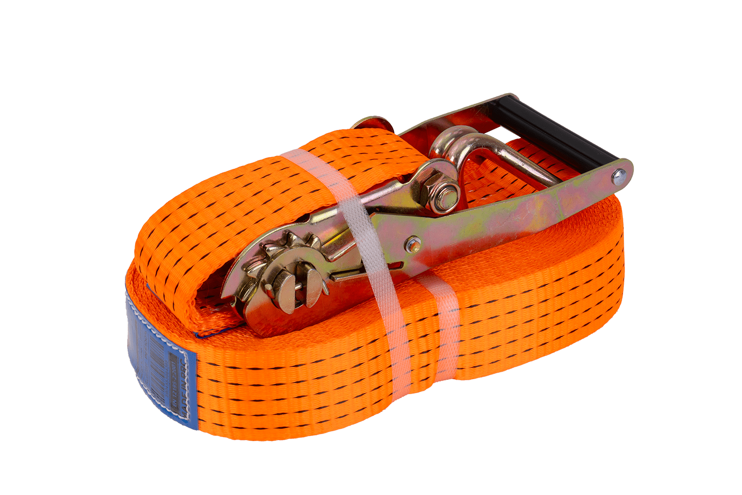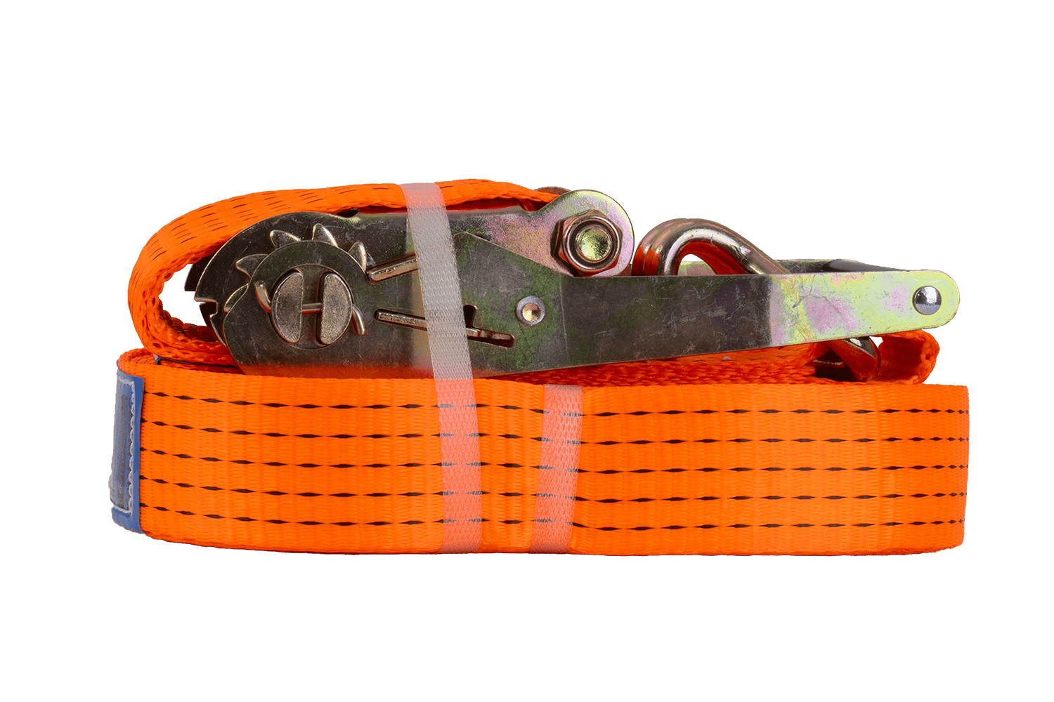 De oranje UNITRAILER ratelband bestaat uit twee delen: een korter deel met ratel en haak, en een langer deel met spanband en haak. De totale lengte van de spanband, inclusief spanband en gesp, is 15 meter , voldoende voor het vastzetten van grotere ladingen. De 50 mm brede spanband zorgt voor voldoende druk. De spanband heeft een robuuste spankracht tot 5 ton (5000 daN) , waardoor hij geschikt is voor het vastzetten van zwaardere ladingen.
