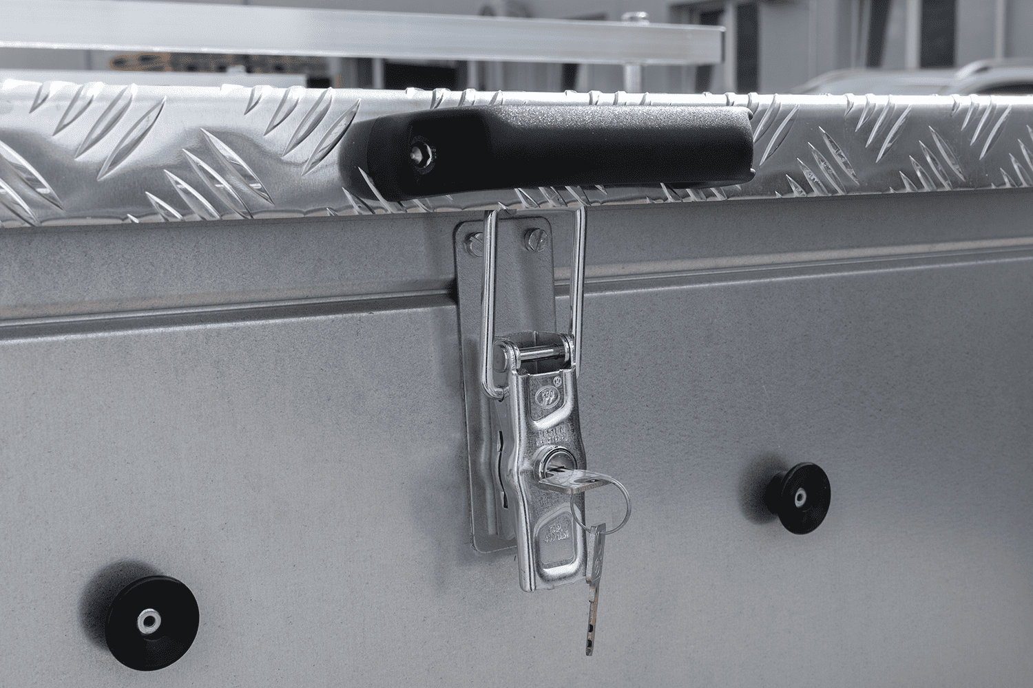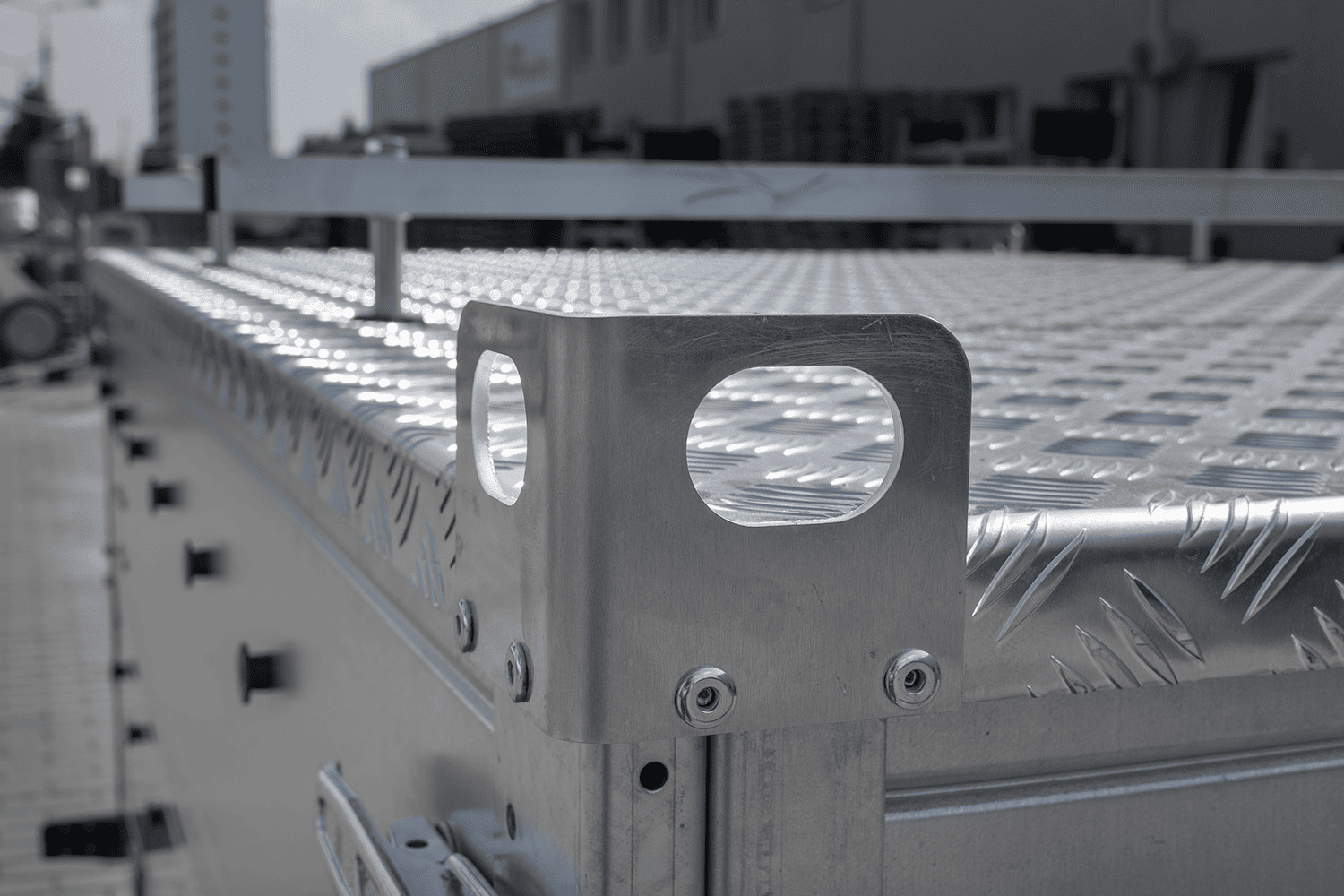 De ALU-afdekkingsset bevat ook aan de zijkant gemonteerde actuatoren waarmee de afdekking gemakkelijk en zonder overmatige kracht kan worden geopend en gesloten. Deze actuatoren zorgen er tevens voor dat de afdekking in de open positie blijft tijdens het lossen van goederen uit het transportgebied. Het product is voorzien van een sleutelslot ter bescherming tegen diefstal. De ALU-afdekking kan worden gemonteerd op de standaard zijpanelen of op extra, volledig BIS-zijpanelen. De buitenafmetingen van de afdekking zijn 2155 x 1347 mm .